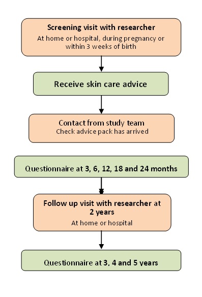 Families entered the study around the time of the birth of the child. They were all given skincare advice, and those in the emollient group were advised to apply moisturisers at least once a day until their child reached their first birthday. Families kindly filled in questionnaires every 6-12 months and the study nurse carried out skin assessments when the children were 2 years old. Questionnaires were also sent to the families when the children are 3, 4 and 5 years old.