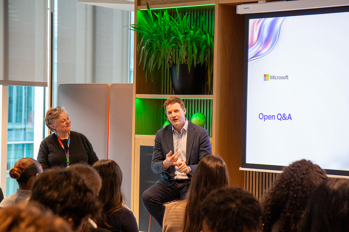 The first element of the day (following a 5.45am coach departure from University Park!) saw our students welcomed to the offices of Microsoft UK & Ireland, where they took part in a Q&A with the CEO Darren Hardman (Economics and Econometrics, 1998).