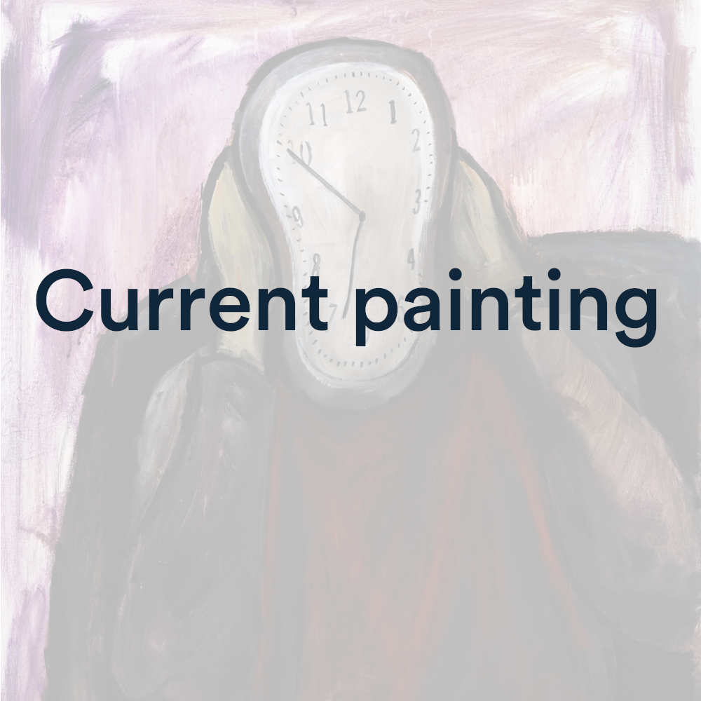 Andy’s painting was inspired by Mustak sitting in a chair talking about how his conditions leaving feeling frustrated and angry at times. He has a strong desire to be free of the noises and voices in his head, and in particular the ticking clock. A clock that he sees as a cheap analogue faced one. He wants to move forward with his life, but as he says: