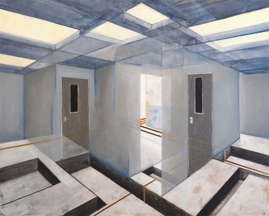 Andy’s painting is an investigation into the idea of barriers to entry, featuring closed or inaccessible doors, mazes, and reflecting on the “dreamlike experience of lockdown” references to the graphical surrealism of MC Escher.