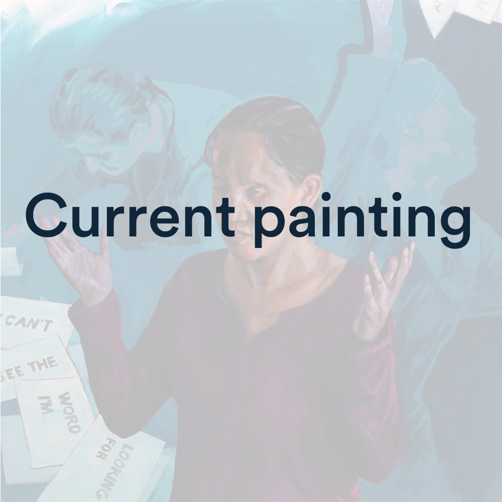 The painting illustrates this inner conflict by showing both the outer Susan, the one others would see, with no visible disability. And showing two representations of her inner self, firstly frantically searching for the correct words on the floor, and then throwing her arms up in frustration as she fails to find the right response.