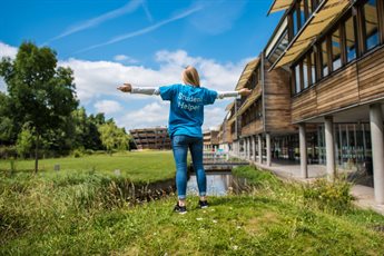 A student wearing a blue student helper t-shirt outside on an open day on Jubilee Campus