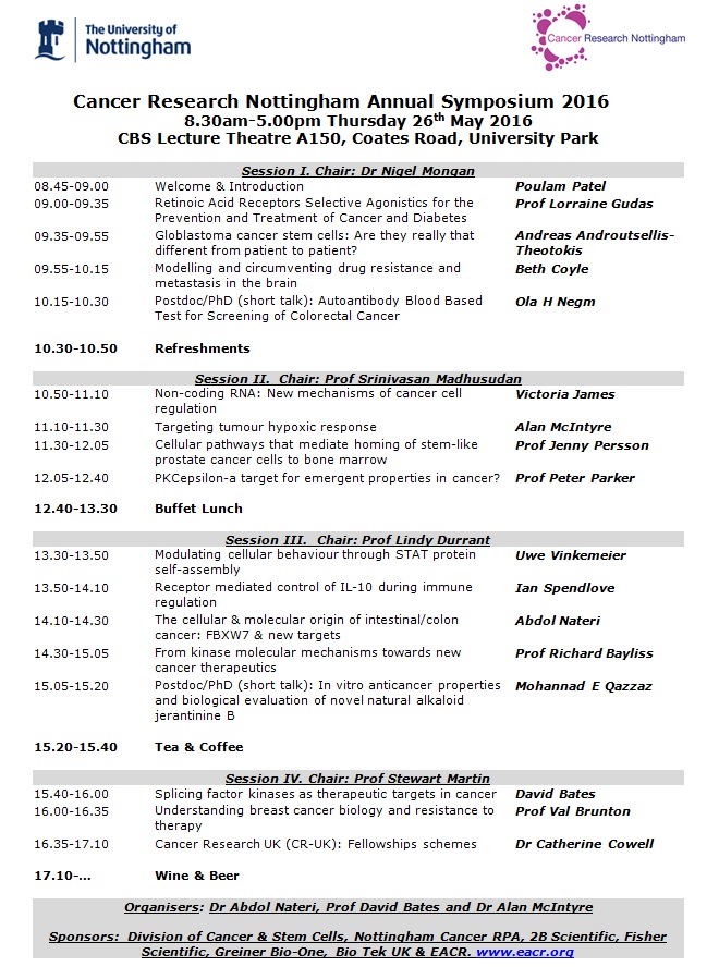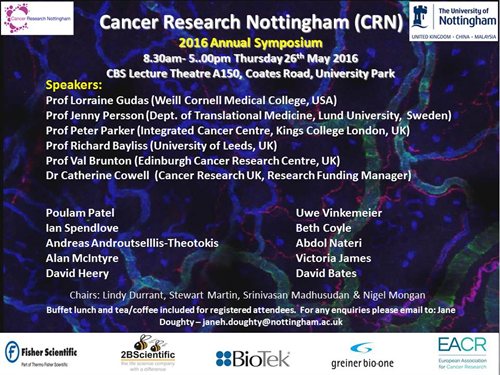 The 2016 Cancer Research Nottingham (CRN) Symposium program featured industrial, medical and scientific sessions of interest to all members of the Cancer Research Priority Area at University of Nottingham. Once again, this year CRN symposium program proved to be so successful and undoubtedly, provided a friendly meeting where our delegates and invited speakers have a chance to interact on both a scientific and social basis.