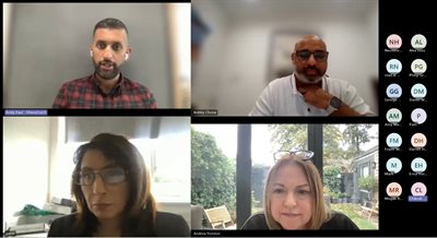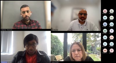 Nermine Habib (centre in the lower row) offering introductory remarks at the start of the webinar. Andy Paul is left in the upper row.