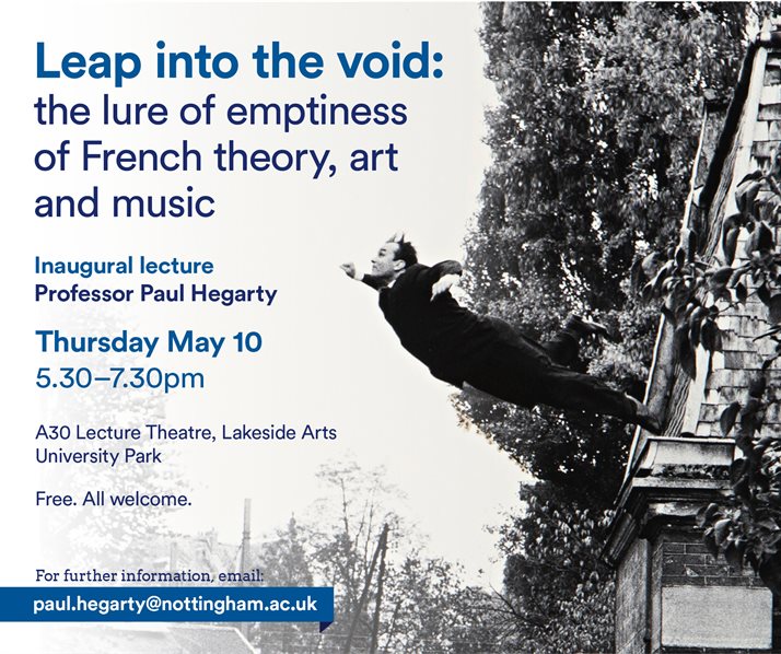 In this talk, I am going to begin with the poetry of Mallarmé, the art of Yves Klein and Marcel Broodthaers, the theories of Blanchot, Baudrillard, Derrida and Deleuze, and end in the work of Romain Perrot (Vomir), leading exponent of harsh noise wall ‘music’. I’ll be hoping to demonstrate that when we start with nothing, and even end in it, we can see the potential of creativity emerge in ways that are far from empty, but instead offer new forms of fullness. Of maybe a new formlessness that is not replete with ordinary stuff, but brimming with excess.