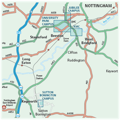 From the south: Leave the M1 at Junction 25 taking the A52 to Nottingham. After five miles you will come to the A6514 (Middleton Boulevard) roundabout. Go straight across (this becomes Derby Road). On your right you will pass the Queen's Medical Centre. About 1 mile past the roundabout turn left onto Triumph Road (HA Fox Jaguar Garage is on the corner). The College is situated on the left after half a mile.