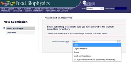 When submitting your manuscript please select the “SI: Hydrocolloids structures determining functionality” option when they are asked to choose an article type after clicking “Submit new manuscript.” (screenshot below). The steps thereafter are identical to a regular submission.