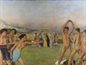 Painting of a seated woman presenting a shield to a young male warrior wearing a helmet standing before her. Two small children hold the warrior's spear while a dog watches.