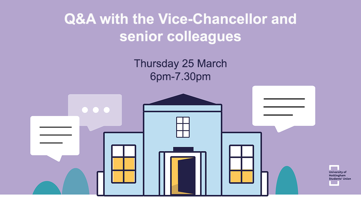 Join a live Q&A session with University of Nottingham Vice-Chancellor Professor Shearer West and colleagues at an event chaired by the SU’s Union Development Officer, Madeleine Fox.