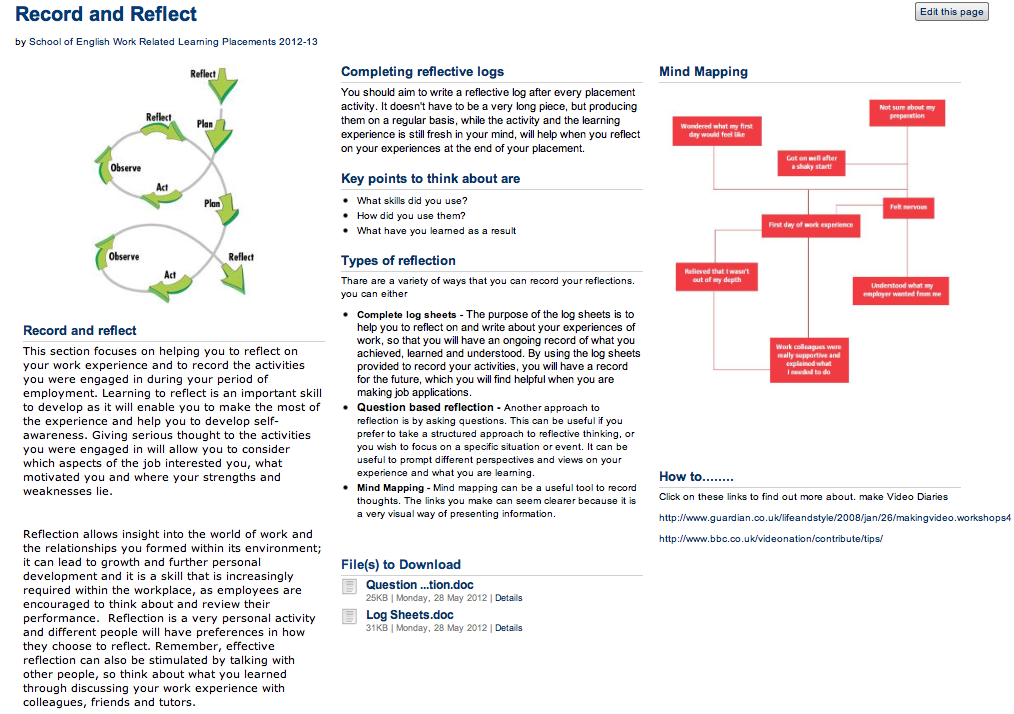 Mahara is an open source ePortfolio system which our students have used to collect together evidence from their work related learning placements and to reflect on their experiences. Shared group pages accessible to all placement students provided advice on successful placements including learning through reflection. An example can be seen below: