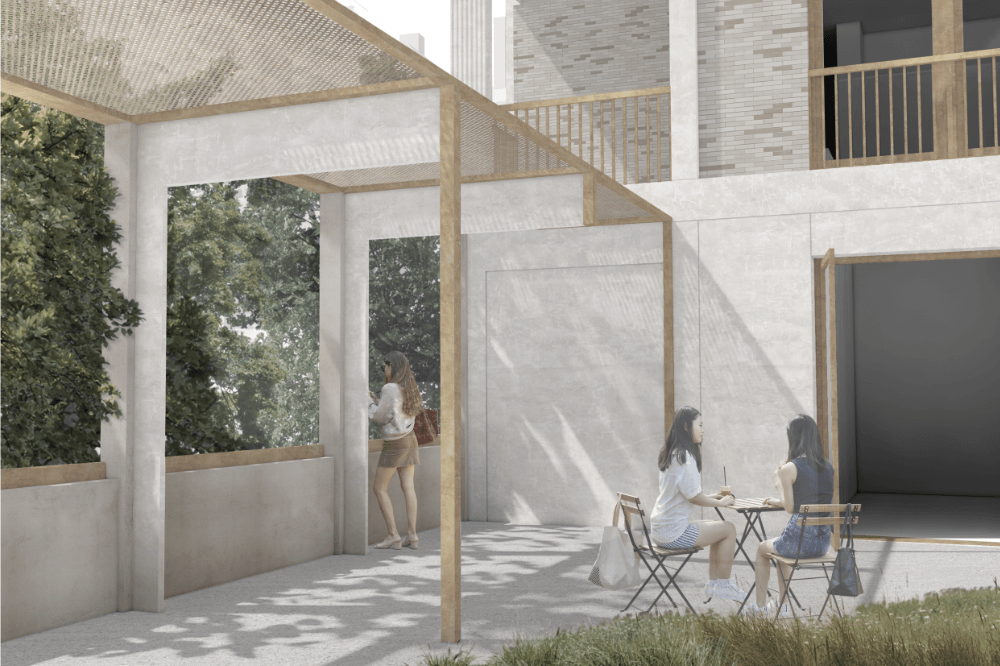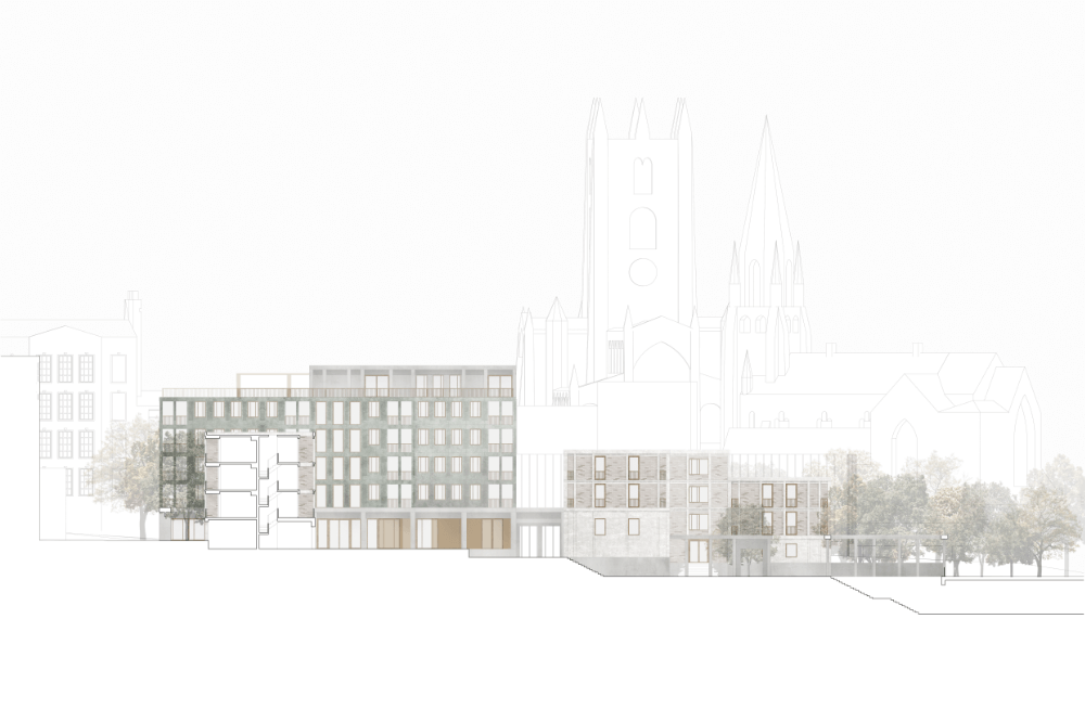 The retrofit of the Severns House structure within the Broadmarsh masterplan presented an opportunity to address a new gateway into the main city centre. The scheme proposes a new co-housing development, focusing on a demographic of recent graduates exploring the concept of ownership within shared spaces. Through the use of informal thresholds and implied distinctions of space, the new proposal populates the site with a series of secluded pocket gardens, encased by a new approach to the protective barrier of the ‘garden wall’. The existing concrete structure is reclad in striking green and brass to mirror the neighbouring Nottingham Contemporary, whilst the intermediate new build structures echo the heavy plinth nature of the Georgian context, softening the transition to the new green gateway along Middle Hill. Studio 2 took an approach of ‘Radical Re-use’ to retrofitting with an emphasis on ‘making’, understanding how buildings are constructed and how that influences architectural expression and the atmosphere within.