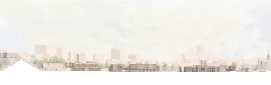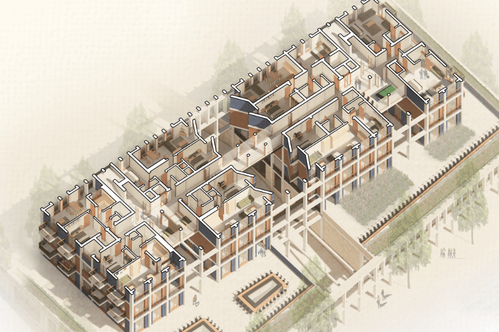 Building on both previous group work to reconfigure the derelict Broadmarsh Centre and the studio’s ethos of catalytic urban interventions, this refurbishment and conversion of the People’s College site along Maid Marian Way reconnects fragmented parts of the city with a cohousing scheme at its heart. A “plinth” housing a museum, library, cinema and café recreates the ancient rock outcrop that once stood on the site, overlooking water features along the old alignment of the River Leen. Above this, housing suitable for recent graduates is situated along reinstated streets and alleyways, repairing vistas towards St. Nicholas’s Church and Nottingham Castle. A stylistic bridge has been formed between the differing conditions at each end of the site, transitioning gradually from the pared back 20th Century buildings to the South and the Arts and Crafts, Watson Fothergill designed structures closer to the castle gatehouse to create a cohousing scheme unique to its context.