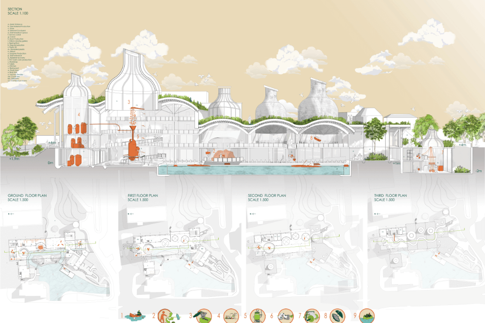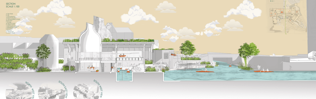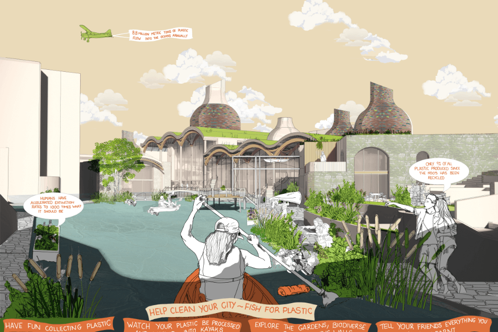 The project explores the multitude of ways in which human actions have riddled the world of its biodiversity. The design seeks to heal our dualism with nature through its programme and materiality. The project rethinks recycling methods, through combing recreation and education with a plastic recycling centre. Waste is collected by the public from the Nottingham Canal through a series of water sports activities. The plastic collected is recycled, using a new enzyme biotechnology, and is combined with flax material to make kayaks. The kayaks are put back onto the canal and are used recreationally by the public. The entire production process is made visible to the public on foot and via an internal canal. This in turn cleans Nottingham, reduces the impact of plastic on the environment, educates people and restores activity to the disused Nottingham Canal. Restoring biodiversity was also integral to the project and was explored through eco-friendly pollutant absorbing bricks, living walls, green roofs, and landscaping.