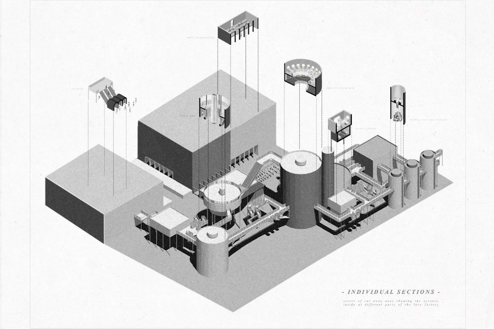 The project explores the complexity of the human psyche through the effects of mundane and monotonous factory working environments. It investigates how our current repetitive lifestyles within a capitalist system neglect our creative, conflicted and complex minds, pushing the majority into true insanity and disassociation. This chaotic downfall is explored through the narrative of a disobedient lace factory, initially representative of logic and order. Over a 10-hour working day, the factory descends into a reckless carnivalesque, transforming from a rigid industrial centre to a lawless free-for-all. It embodies the extraordinary, encompassing hedonism, greed, chaos and leisure. Although a highly bizarre narrative, this is not far from reality with increasing numbers of exploited workers across the globe from textile workers in Leicester, to salarymen in Japan.