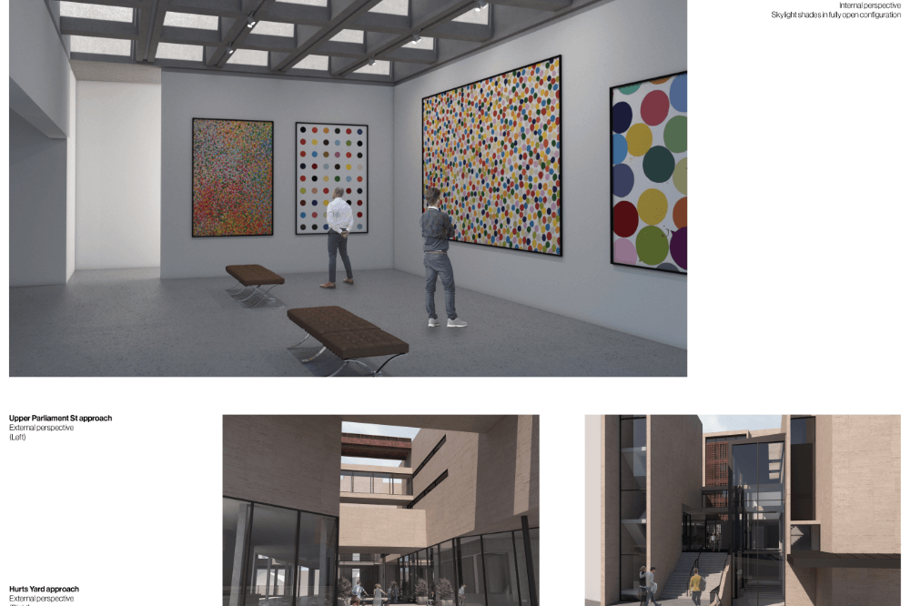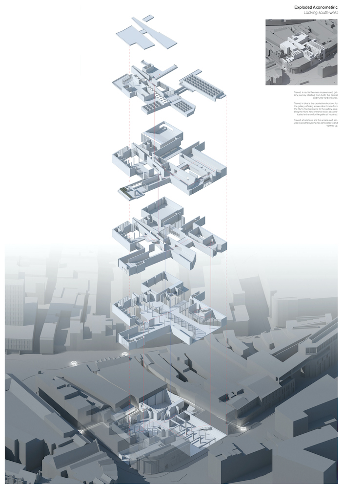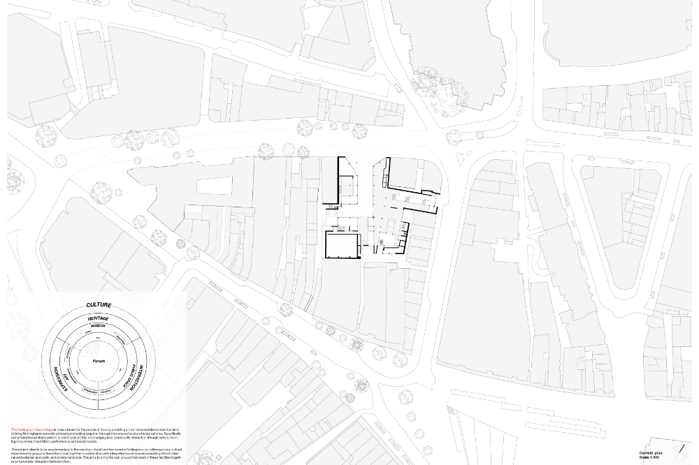This project intends to be supplementary to the existing cultural facilities found in Nottingham but offering a new cultural experience by grouping these functions together in combination with integrated social spaces consisting of both internal and external, and public and private variations. This aims to bring the user groups from each of these facilities together and promote interaction between them.