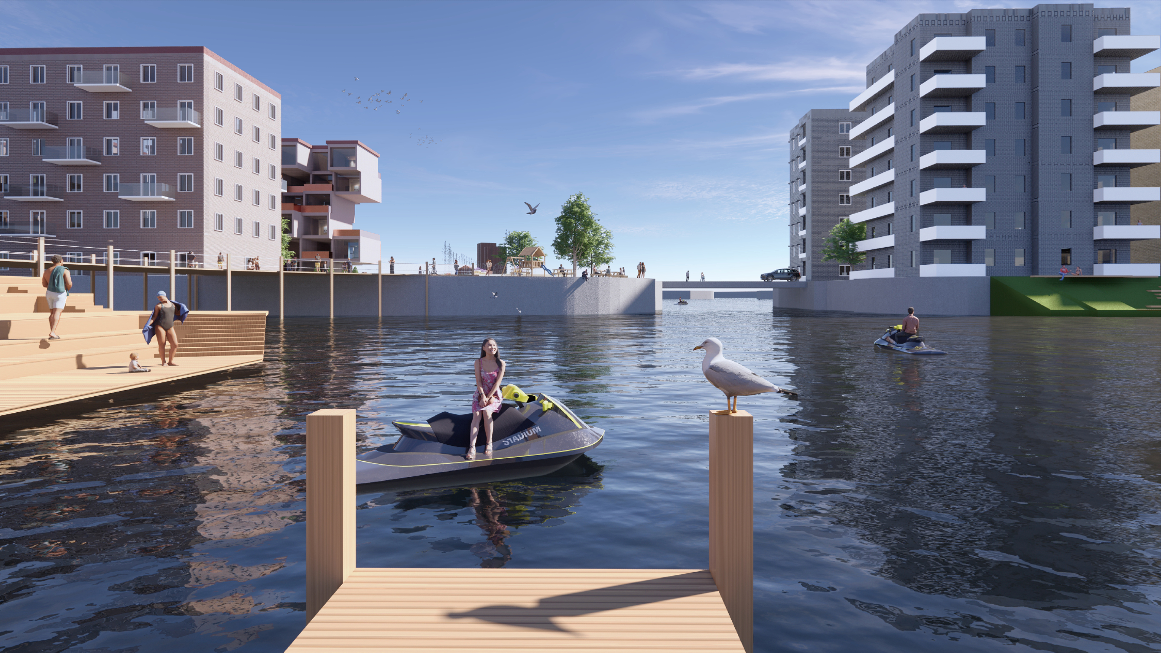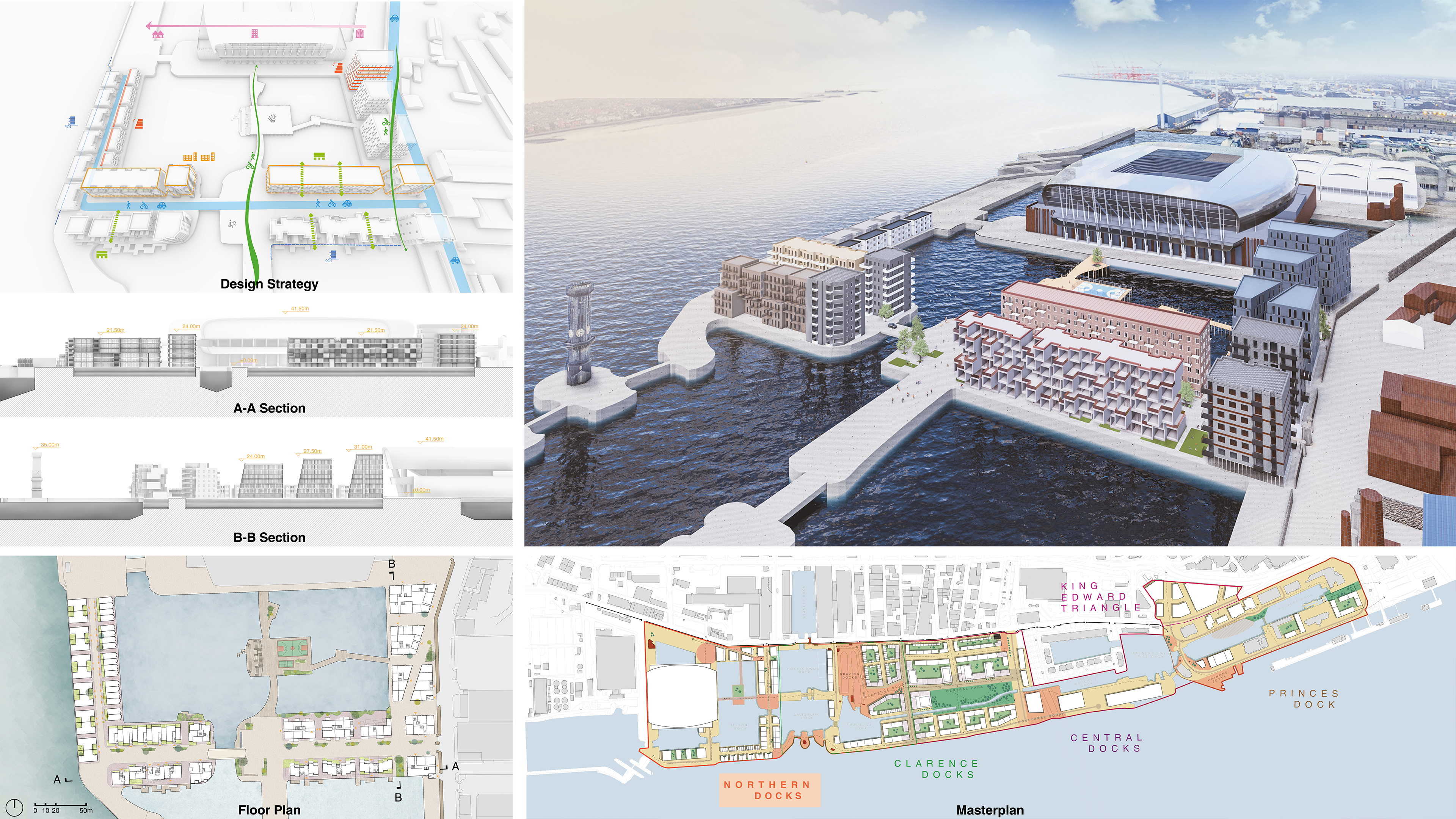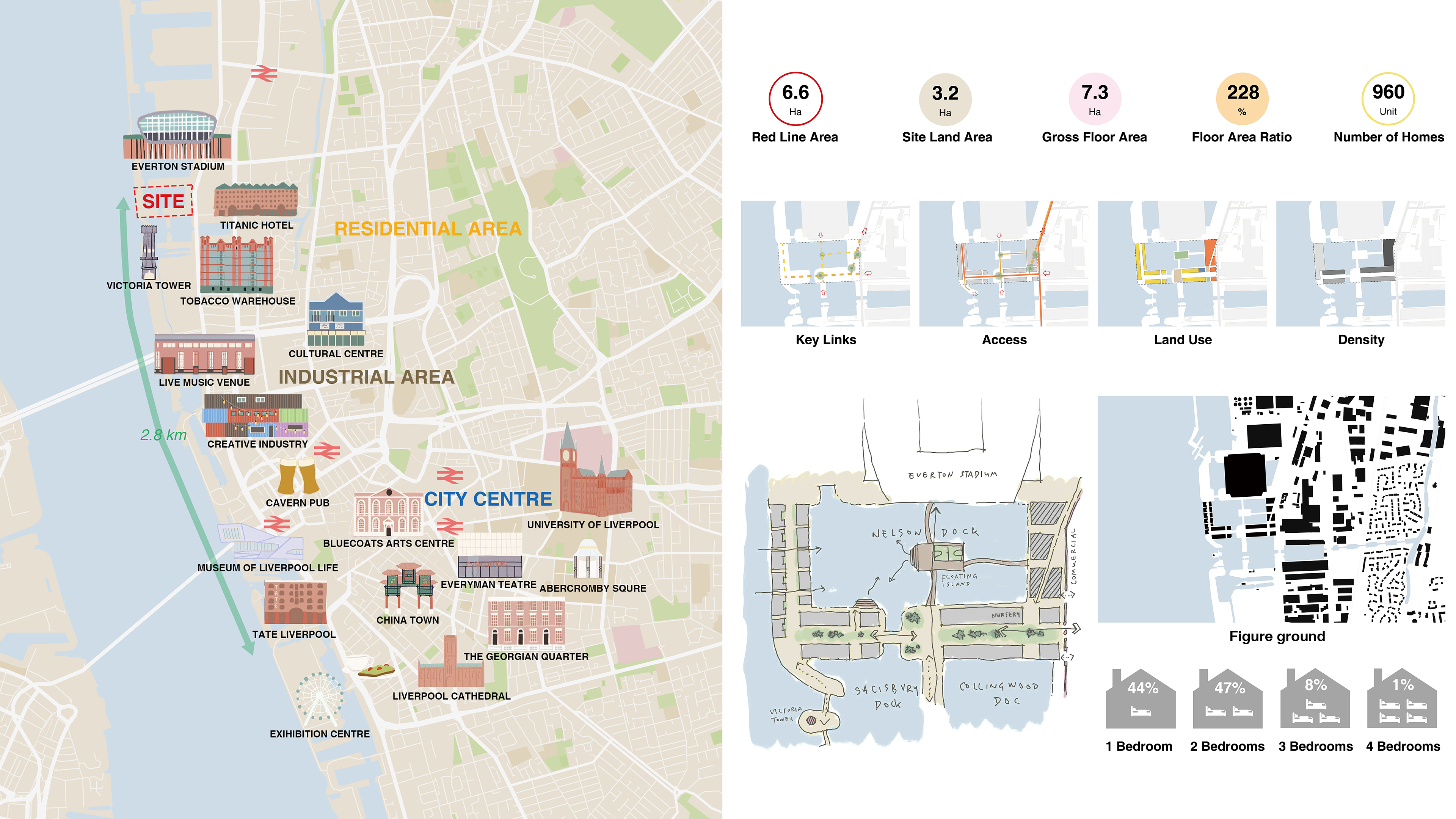 This studio project aimed to link housing research in dense waterfront typologies and residential master planning with mixed-use components. The assignment included the masterplan design of an entire neighbourhood and the architectural design of one representative residential block. Liverpool Waters is a new mixed-use development, delivering five new distinct neighbourhoods at the edge of Liverpool’s city centre. This project focuses on master planning Northern Docks, a neighbourhood with historical heritage and a modern lifestyle. Carved out by the water network, the backdrop of ancient industrial buildings and a new world-class stadium, Northern Docks has the opportunities for on-land and on-water living. The design followed a high-density experiment while creating a high quality of life in this neighbourhood, aiming to attract people of different social backgrounds to live together. The main strategy was to provide townhouses in the western part of the site to attract families, to integrate a leisure centre as a landmark, and to establish flats and services in the neighbourhood's eastern part.