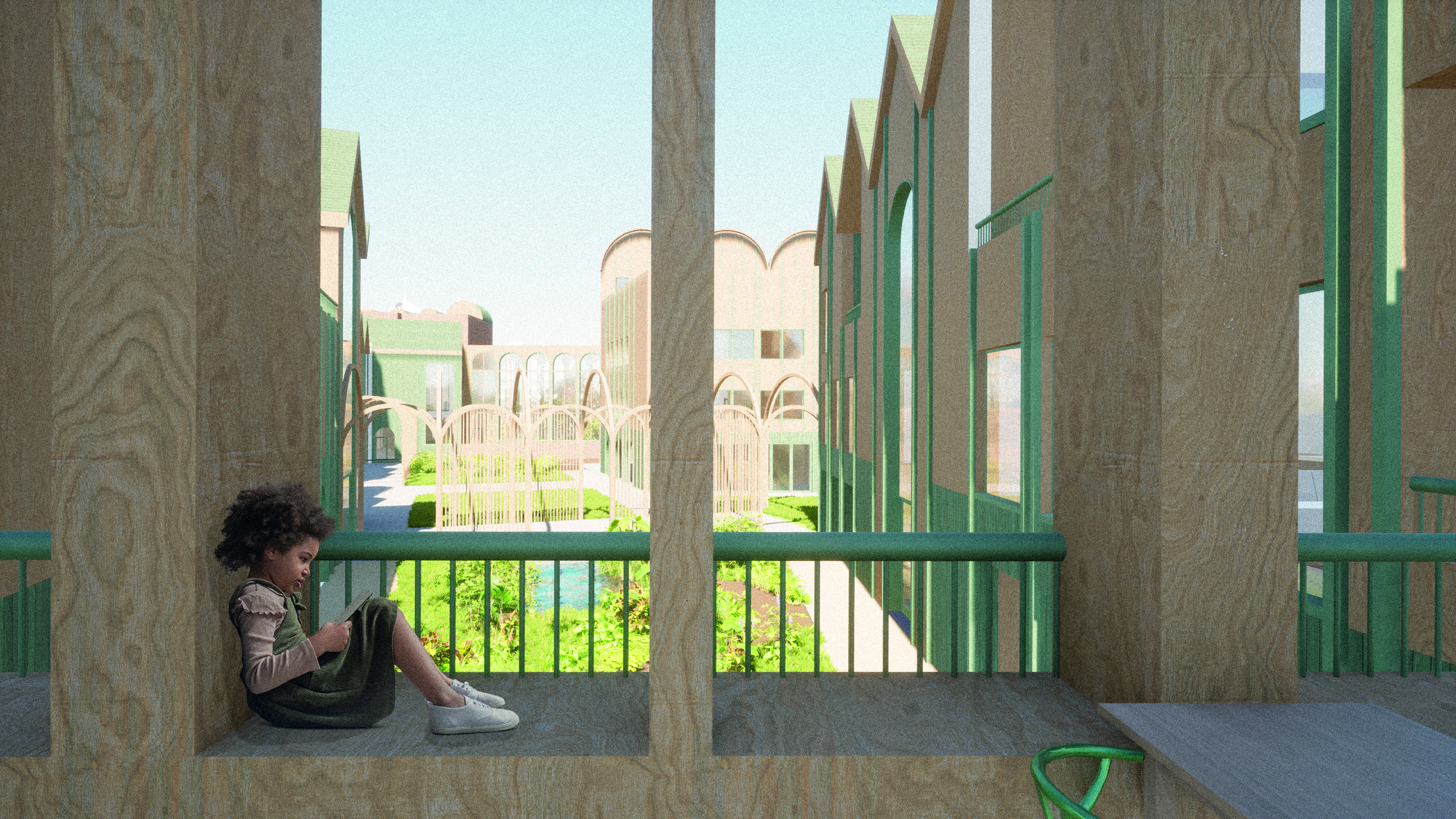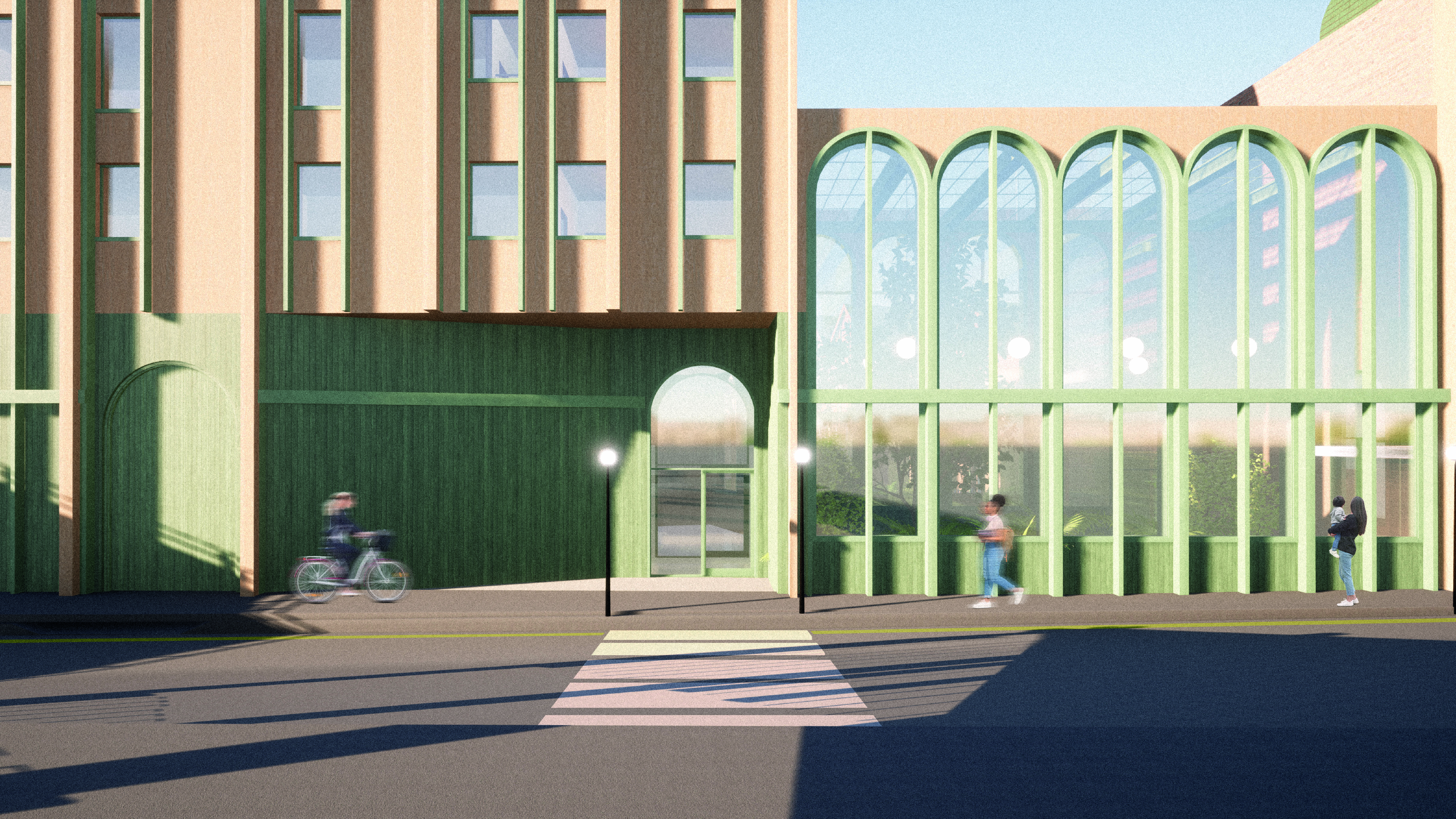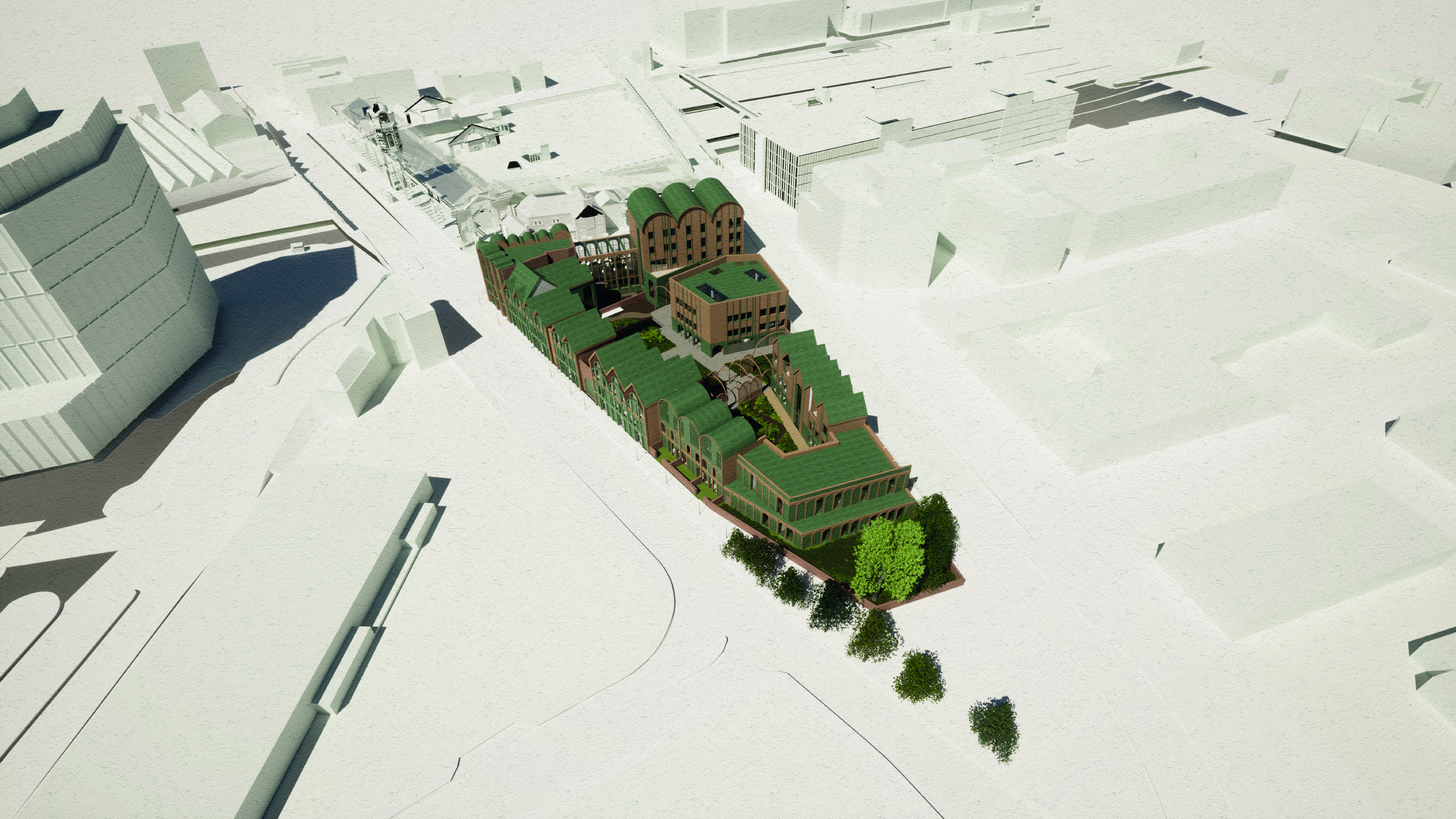 The Architectural form takes reference from Nottingham railway and the previously demolished Arkwright Station showing the arch transposed throughout the site as not only a historic reference but also a symbol of strength and support. The diversification supports a sustainable living model for the residents and promotes new opportunity to the wider community via the active edges, encouraging engagement with the site.