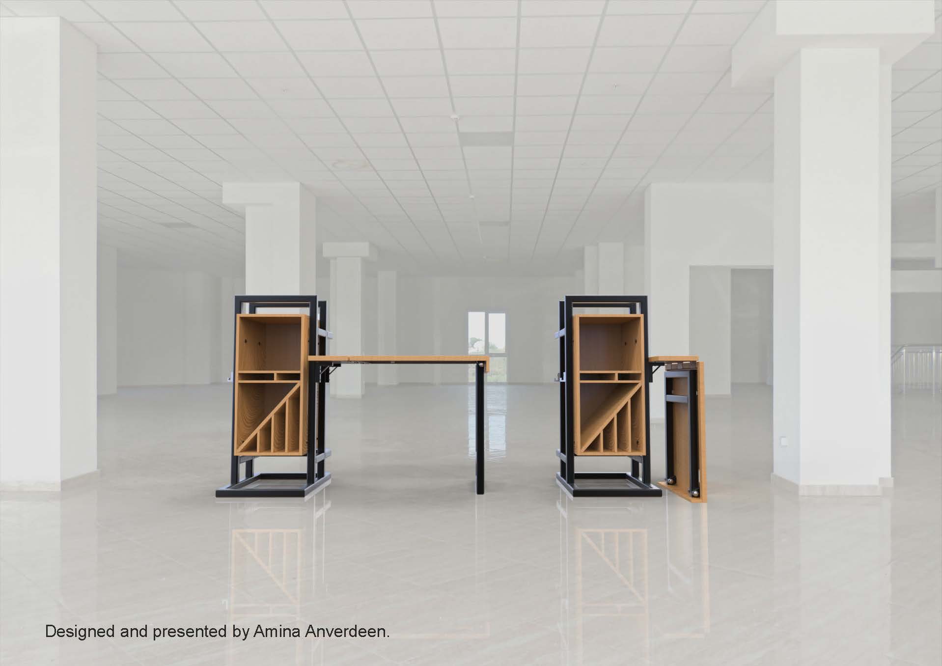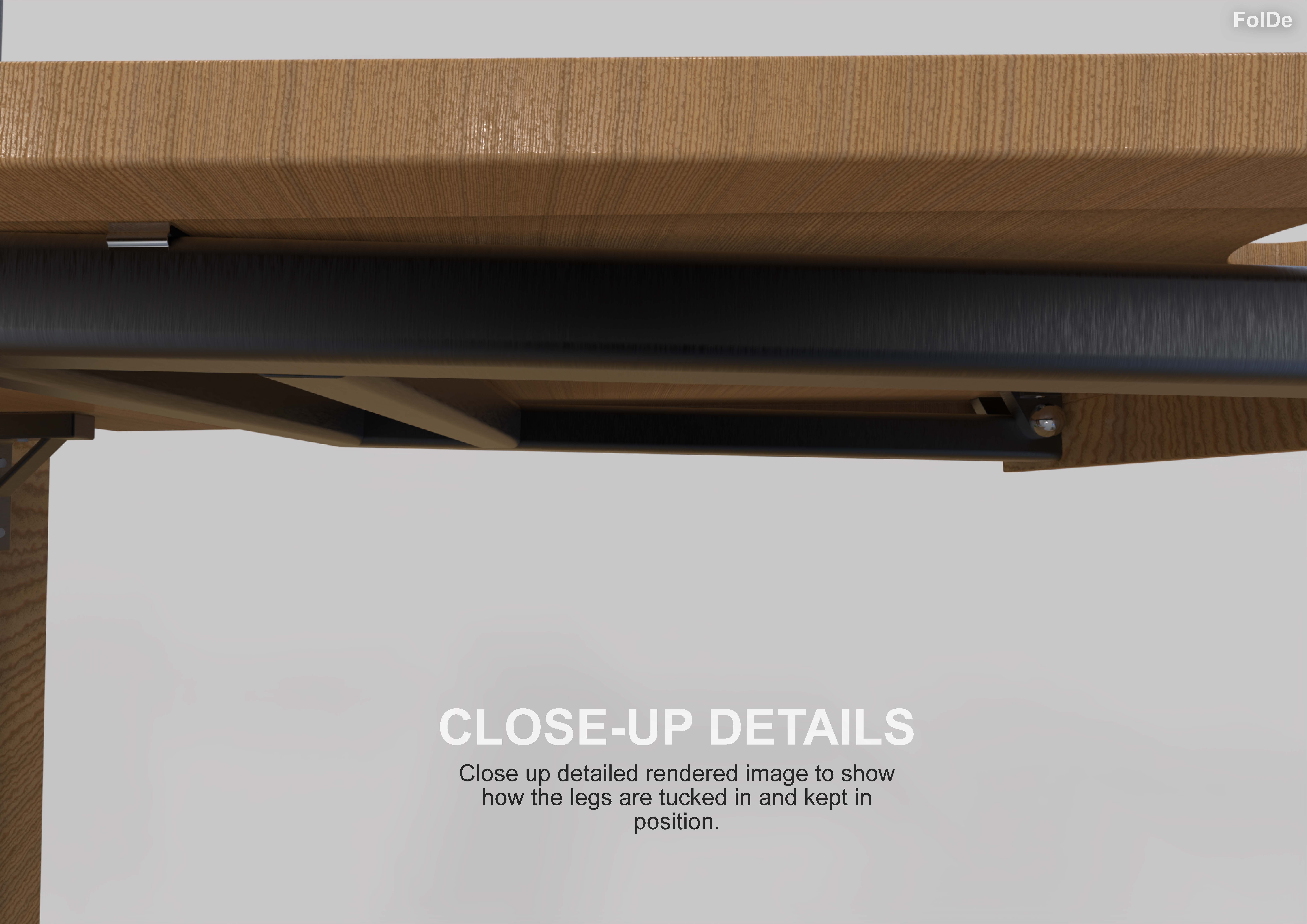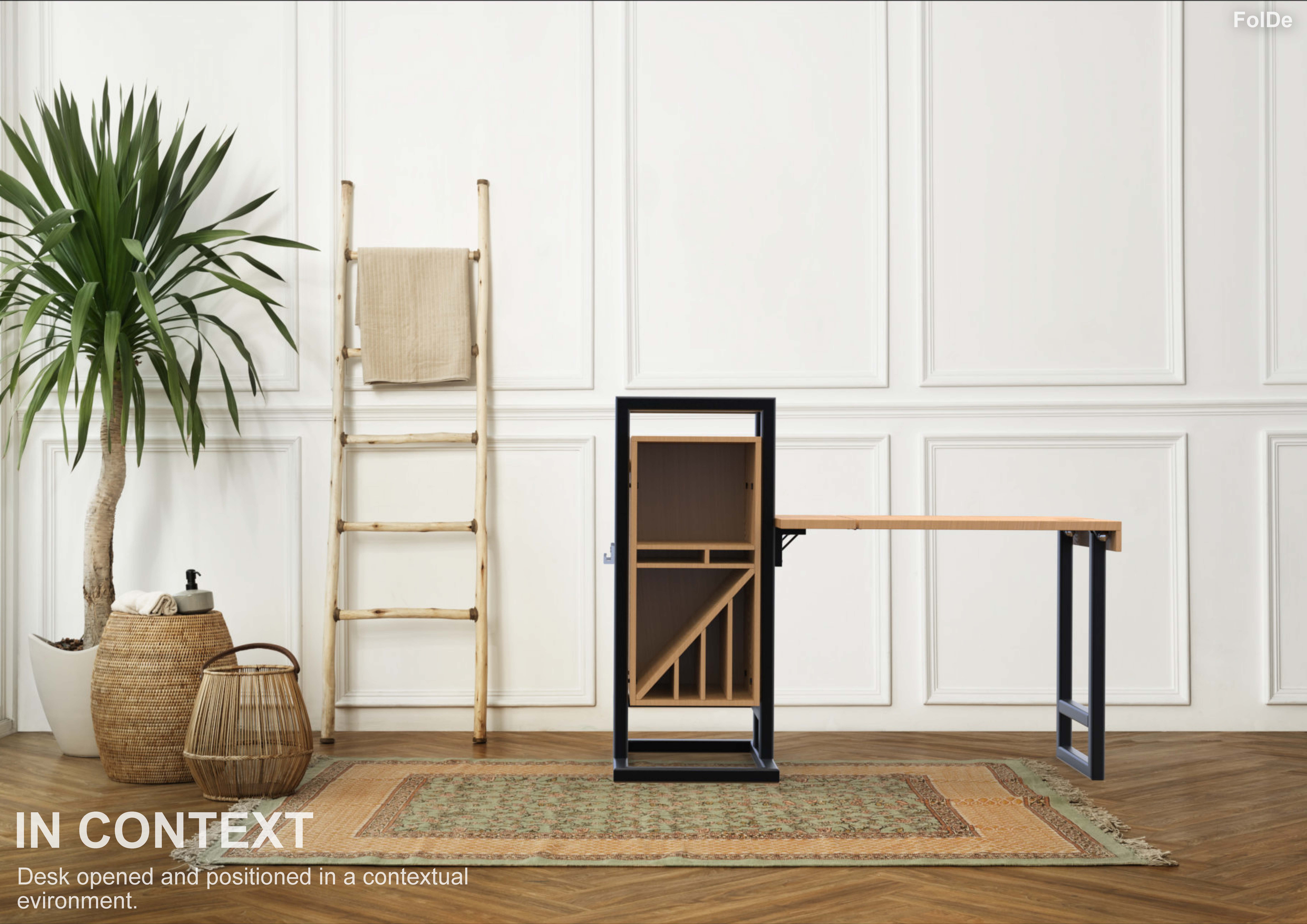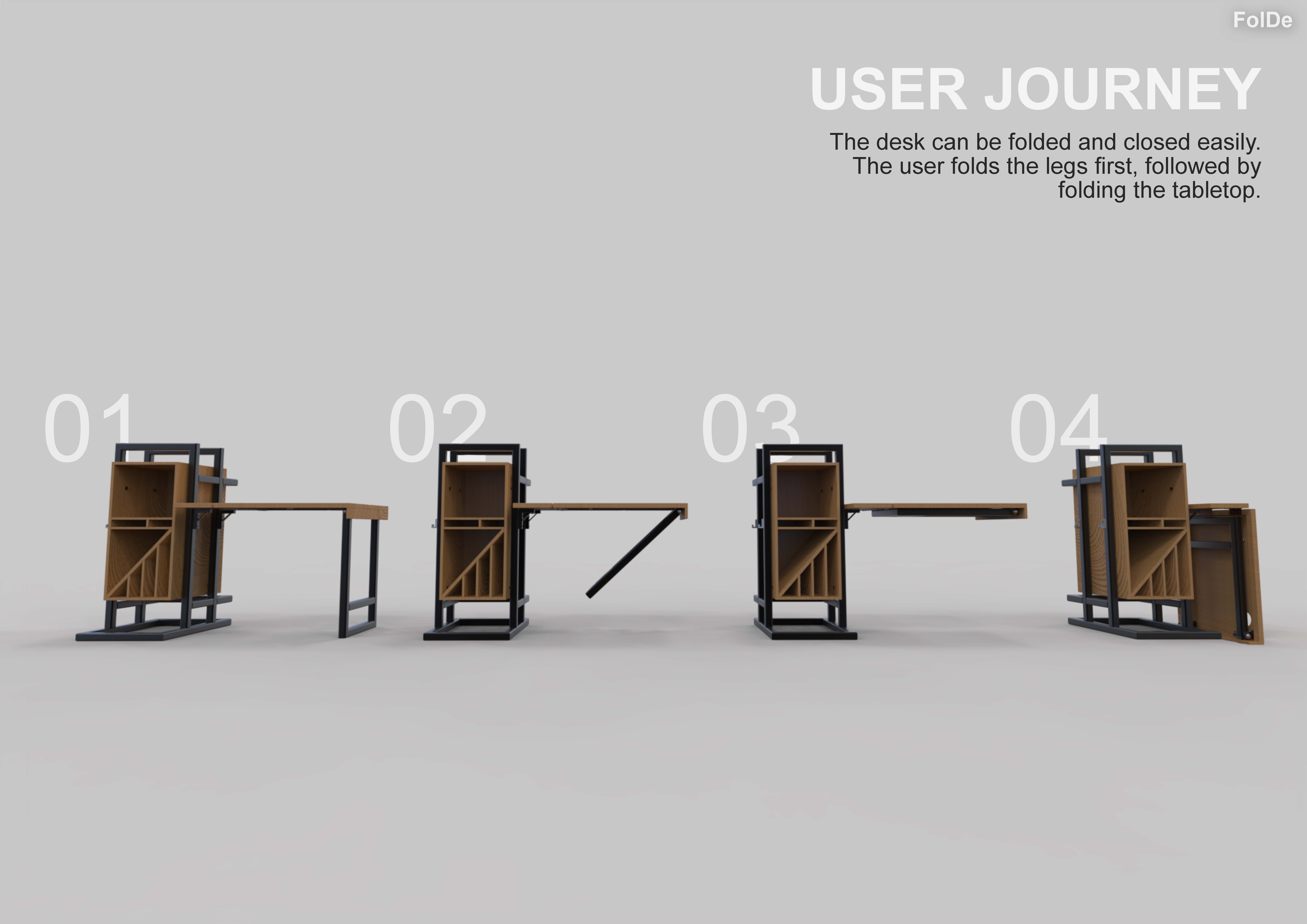 The drastic changes in behaviours of labourers working from home due to the pandemic meant that many had opted to buying a desk to help accommodate them with their new working environment from home. These unexpected series of events drove most home workers to not be able to have a desk be always up as many did of them did not have enough spacing. That being said, with the foldable desks, space is not compromised as the desk can be put out when needed and folded and packed away when not needed. As a result of this, the purpose of this project is to design a desk that can be folded and packed away. The name FolDe, is derived from ‘Folding Desk’, Fol(ding) De(sk), essentially making up the product’s name and it is pronounced as ‘fold’. Like the name of the product, the idea of the product is to be able to fold and be put away when not needed, providing a solution to those labourers who didn’t have sufficient amount of space at their homes.