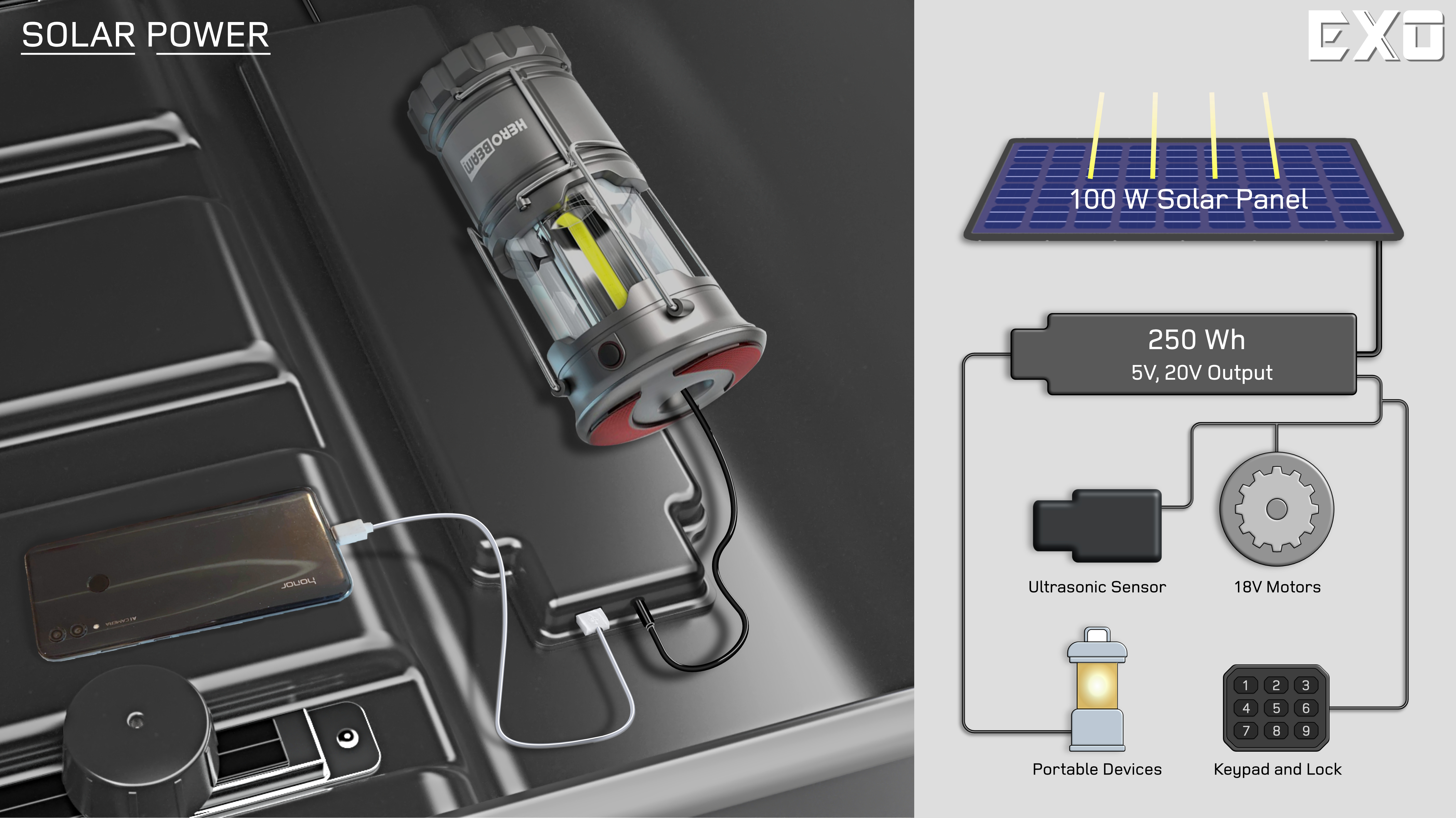 The solar panel and battery provide off grid power to the user when they are off grid on trips and adventures. It also provides power to all the electrical features, so it is completely self-sustainable.
