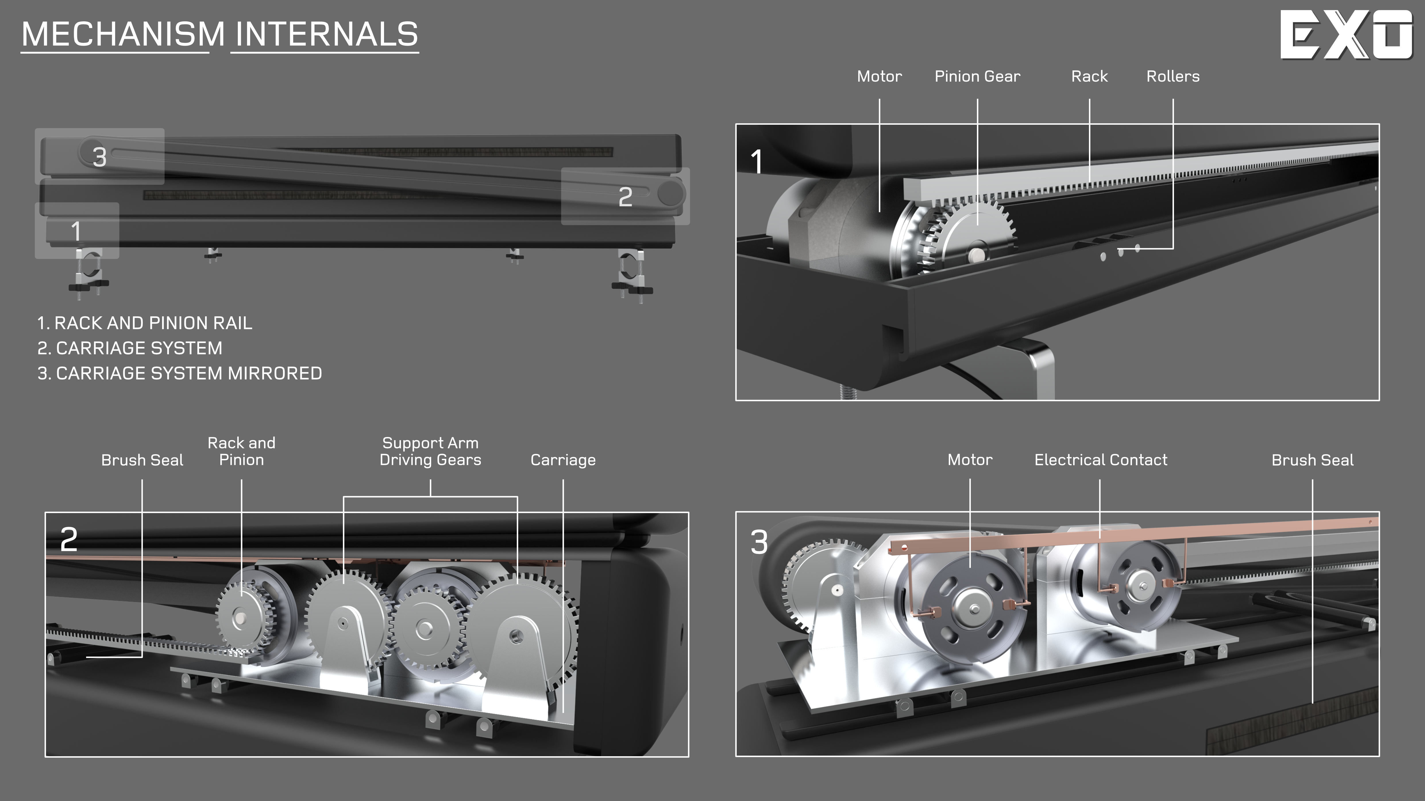 The mechanism is made up of three layers of rails. The first rail is a rack and pinion rail which is responsible for moving the whole system horizontally out from the edge of the vehicle. It does this when the fixed motor turns anticlockwise, and the pinion gear engages with the rack driving it to the left. This drives the second and third rail out with it. The second and third rails are made from the same subassemblies but mirrored and flipped to work in the opposite direction. These too have a rack and pinion mechanism which drives a carriage with a second motor on it along. This second motor drives the gears which rotate the support arms allowing the systems to lower down in a parallel motion. The whole system is powered by the battery pack and an Arduino board that controls the sequence of motion.