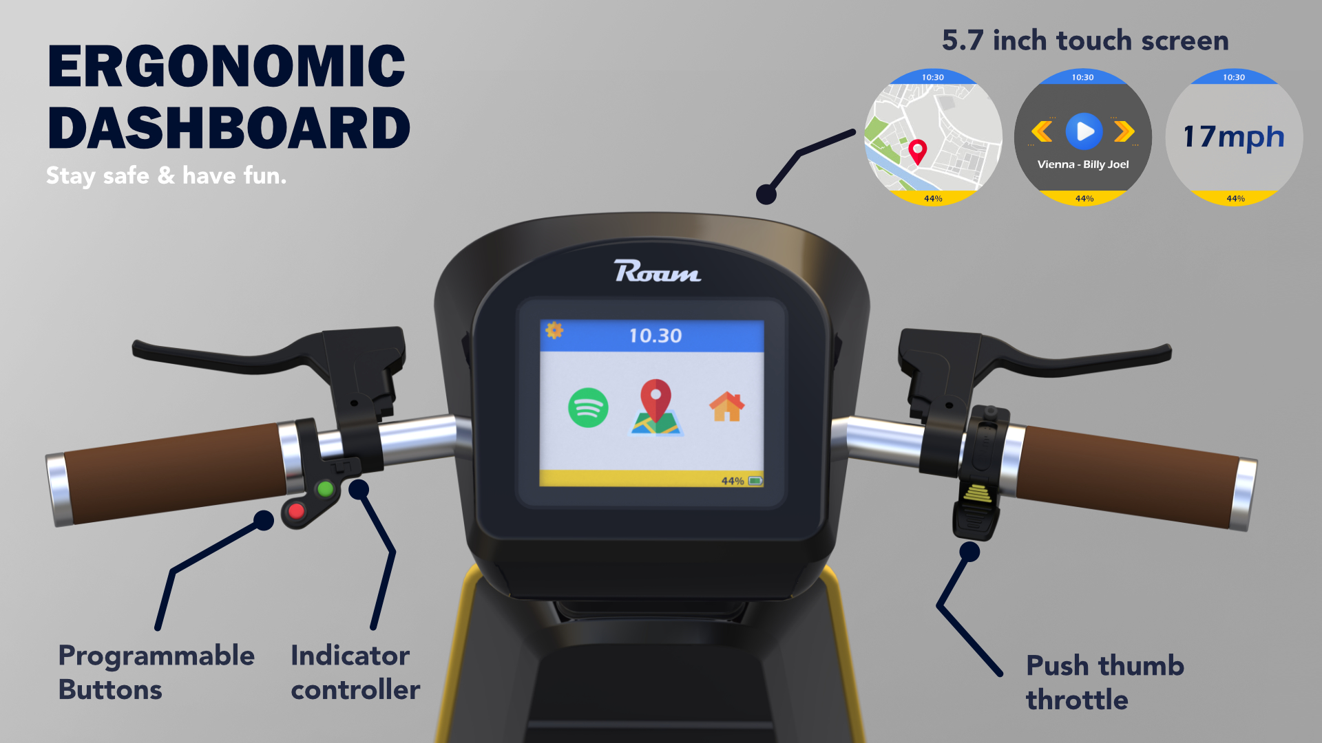 My research showed that women and those over 35 are more likely to be nervous scooter users. To help guarantee a comfortable and safe ride, Roam was designed with an extra-large deck, 10” pneumatic wheels and front and rear suspension. Bluetooth compatibility allows users to connect to the 5.7” touch screen to leverage map or music apps in a safe and controlled manner.