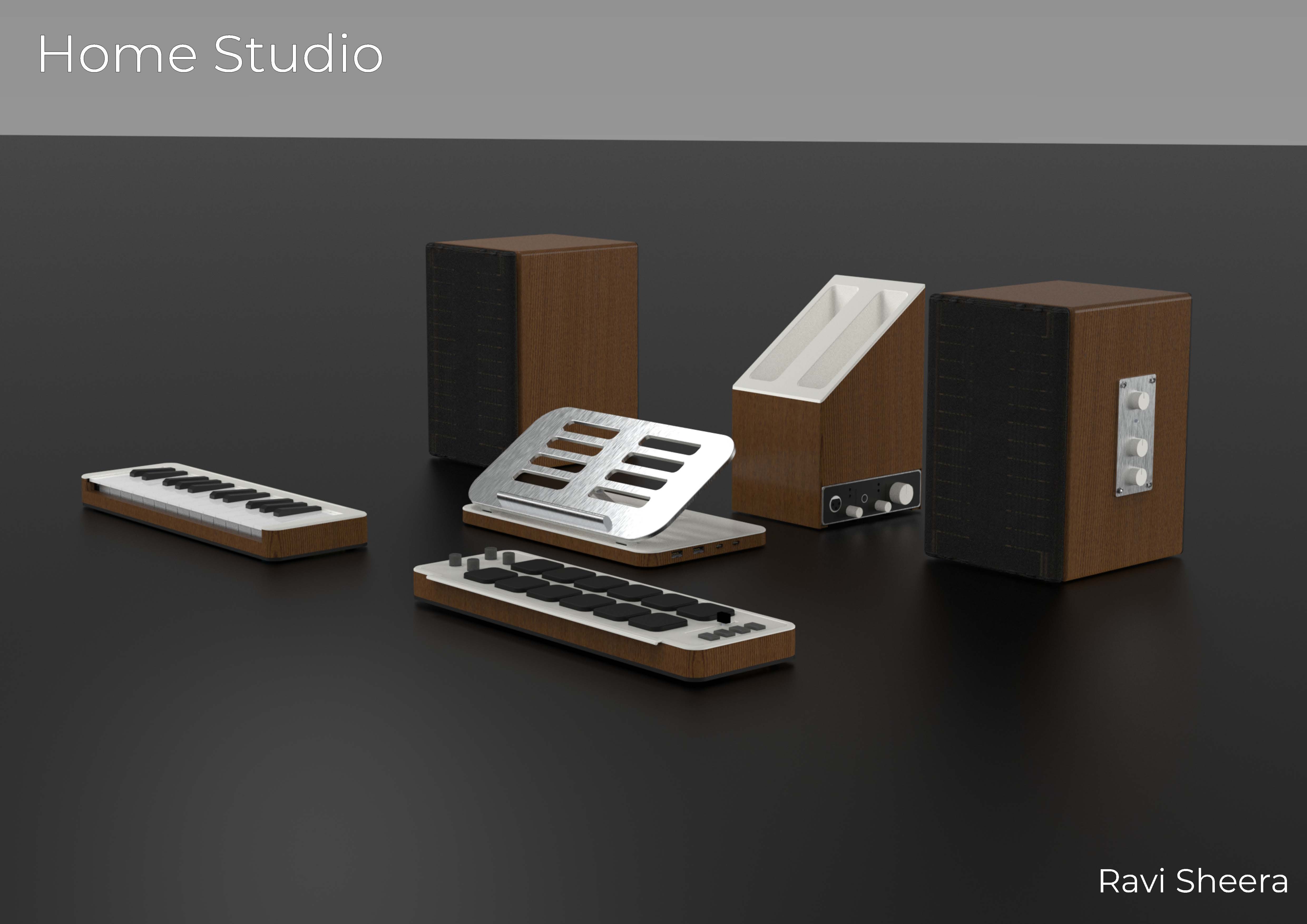 Recently with the streaming revolution, musicians around the world have more opportunity that ever to share their music. As spotify shows that the number of musicians has doubled in the past 3 years, it became obvious how there is no standard for music production equipment. My major project is a beginner home studio aimed for those who are just starting out in music production. It includes two speakers, a midi keyboard, a midi drum pad, laptop stand and a storage area that doubles up as an audio interface.