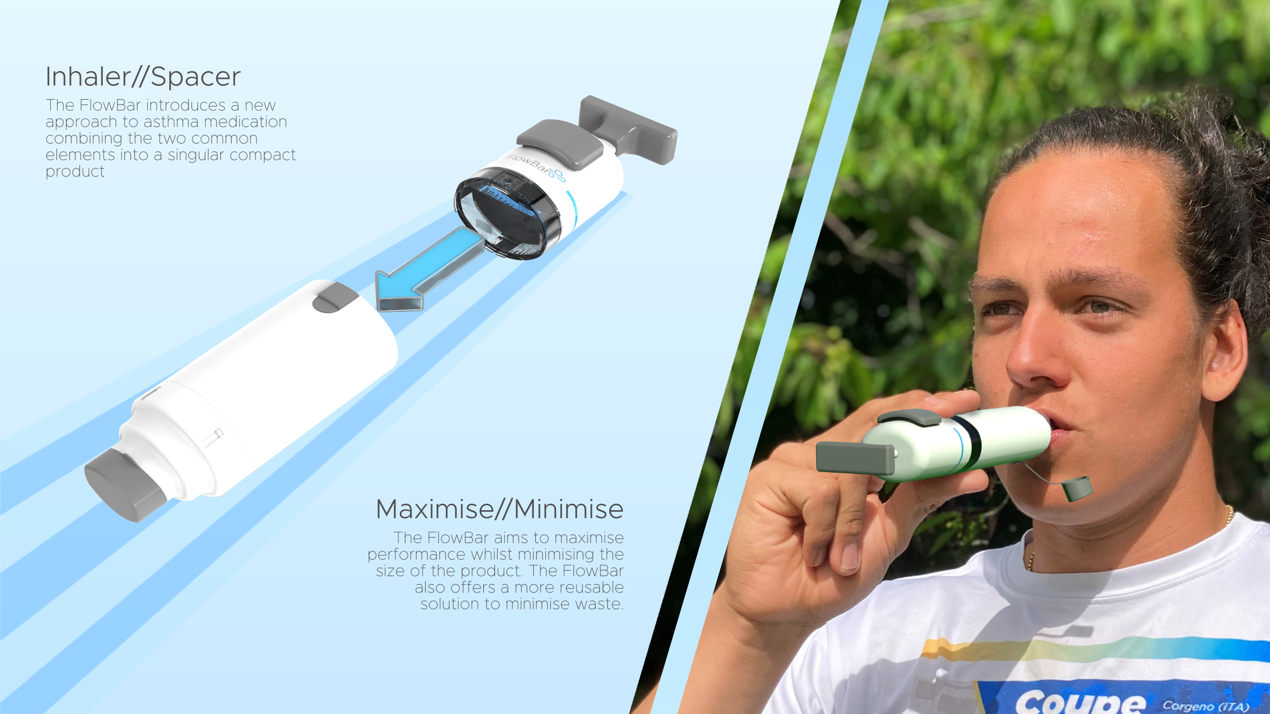 The FlowBar has several key features that really puts itself clear of other products on the market. The first being the angled mouthpiece, this innovative concept intuitively causes the user to raise their chin whilst in use which then opens the users’ airways allowing more medication to reach all the necessary locations. Another integral feature is the TEMISH filter, this is a porous membrane which allows the infused gases to pass through but not any medication. Another very important aspect of the product is the materials used, a specific Polypropylene Copolymer was used due to the material’s conductive properties. This is important as this reduces the number of electrostatic charges, these charges can attract the medication to the surfaces of the product and restrict the dosage supplied significantly. With these features and even more, I believe that the FlowBar successfully meets all three key objectives that were set at the beginning of the project and truly is ‘the Modern Asthma Solution’.