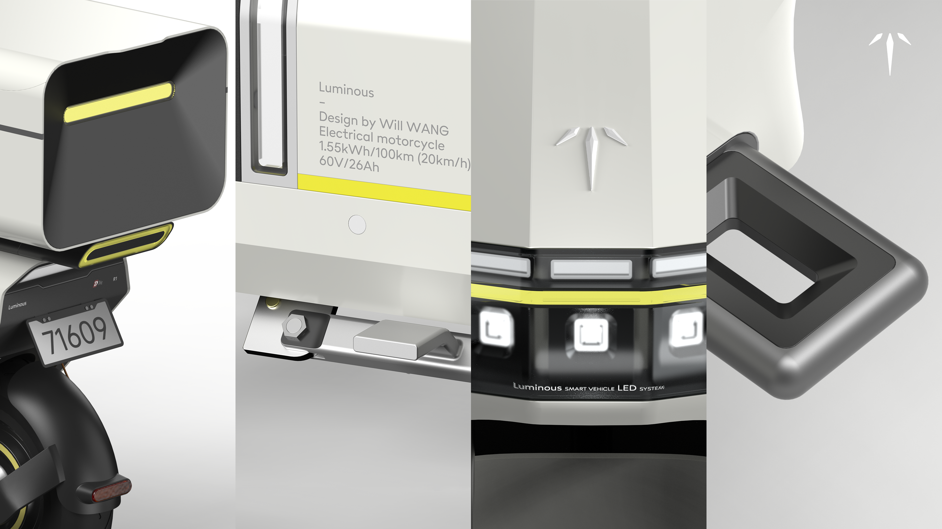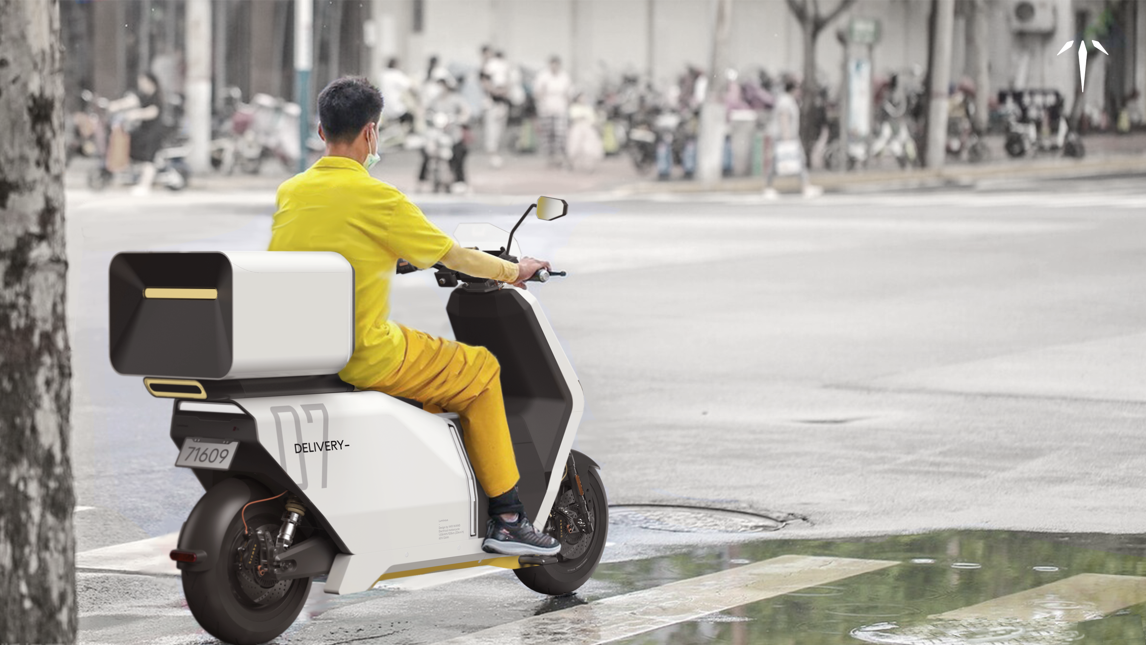 The aim of this project is to provide delivery man a new motorcycle, looking specifically at China's market. The aim is to improve the interaction experience of motorcycle, make motorcycles more suitable for delivering food. This new motorcycle has more storage space and will provide a more comfortable riding experience. It has a single seat and a backrest for rider to take a break. The front and rear food boxes allow them to have enough space to put their food. The mobile phone holder they often use has also been placed in a more suitable position, and the new fixing structure makes it easier for them to take down and install their phone. The motorcycle has a replaceable battery that allows the rider to charge it up quickly. Hope this new motorcycle can provide a more comfortable working experience for delivery workers.