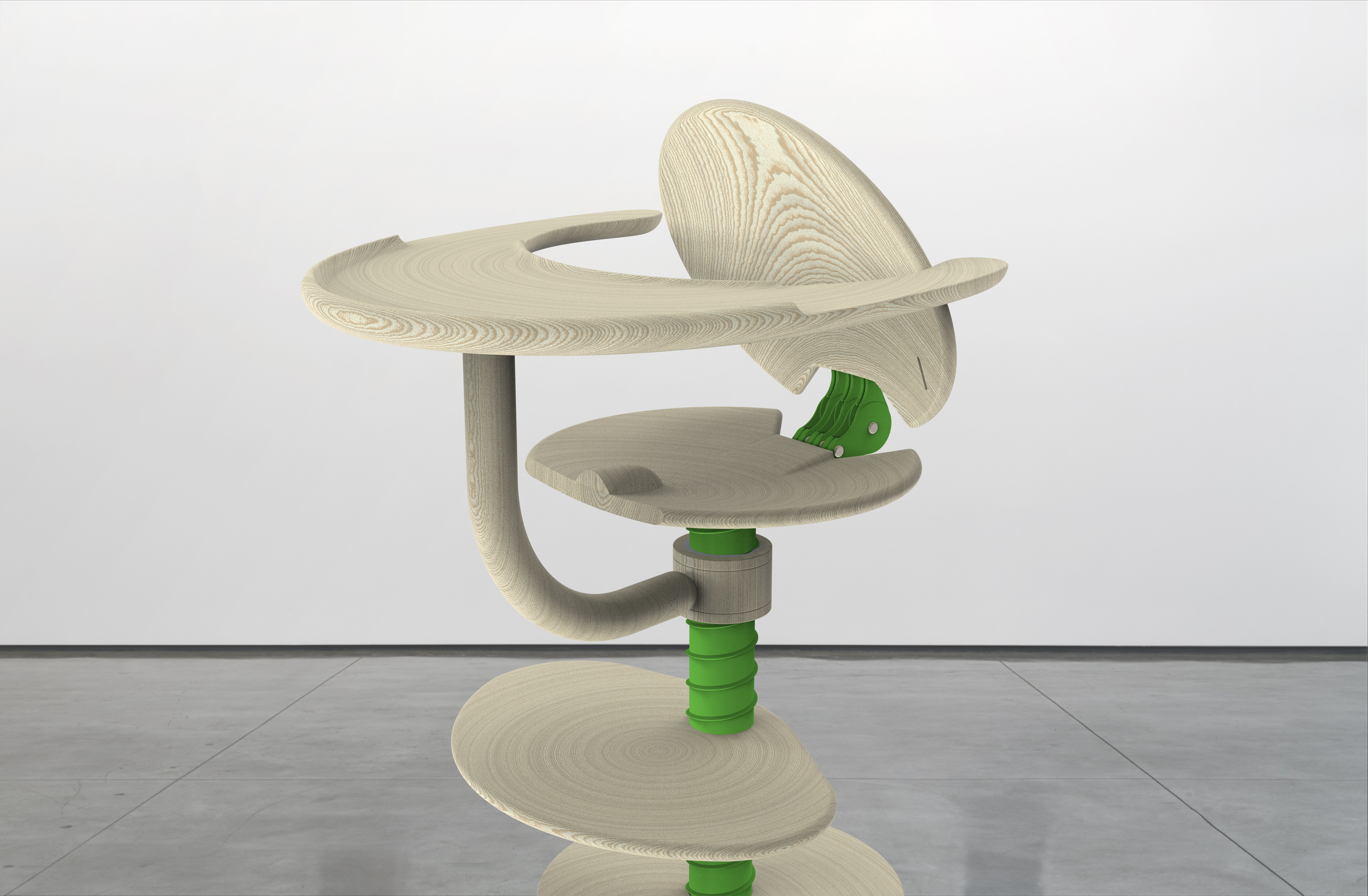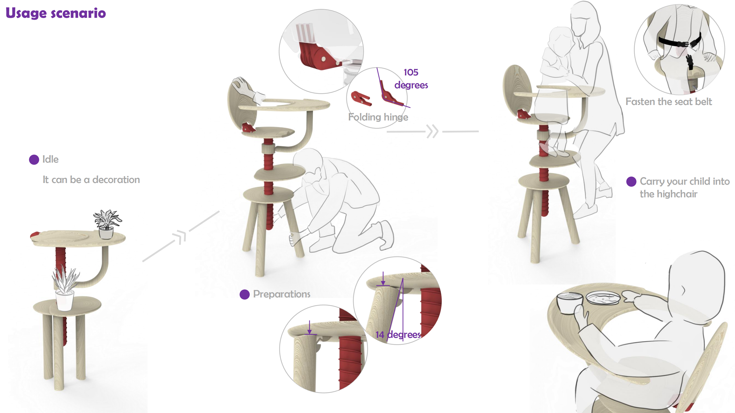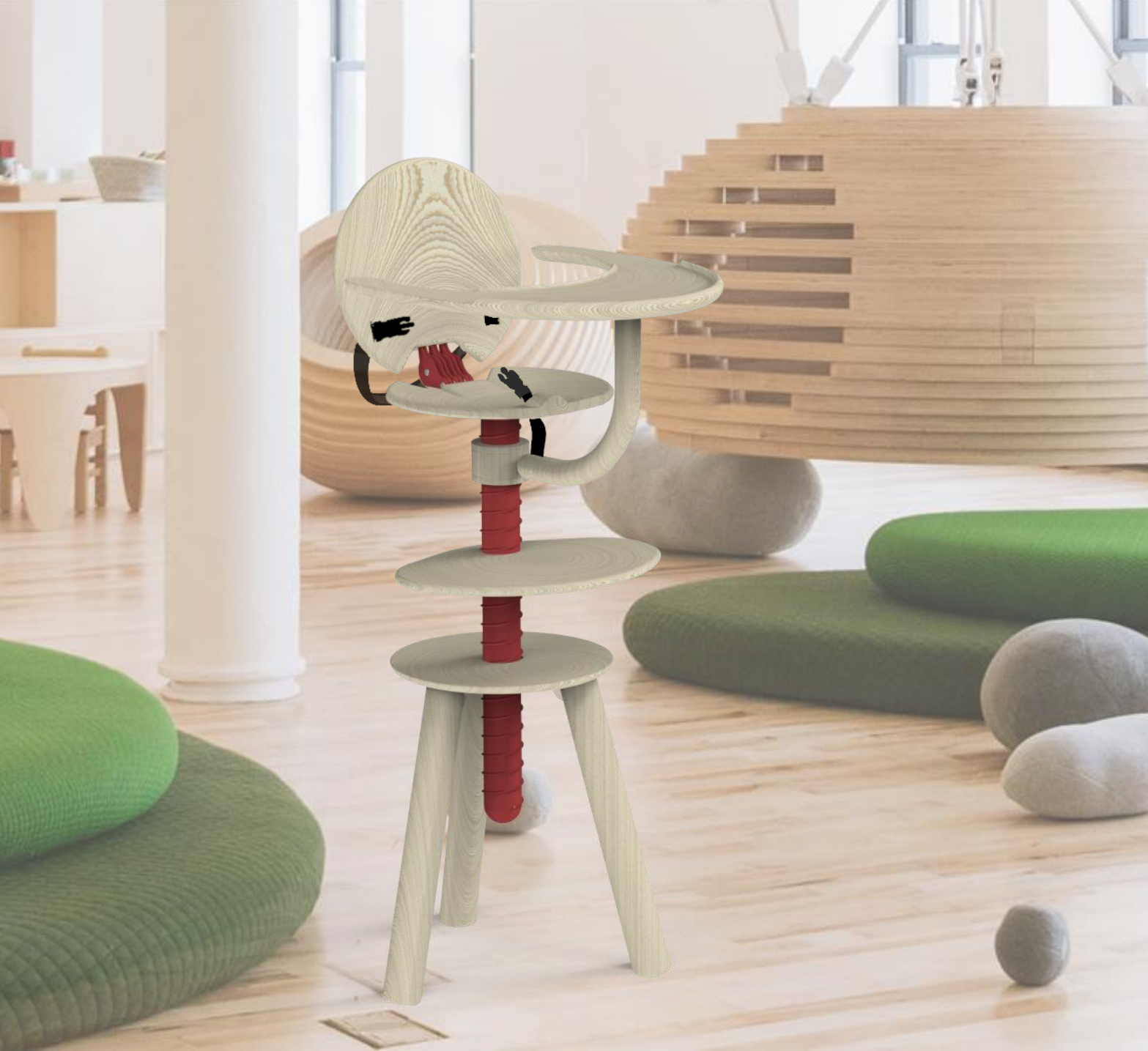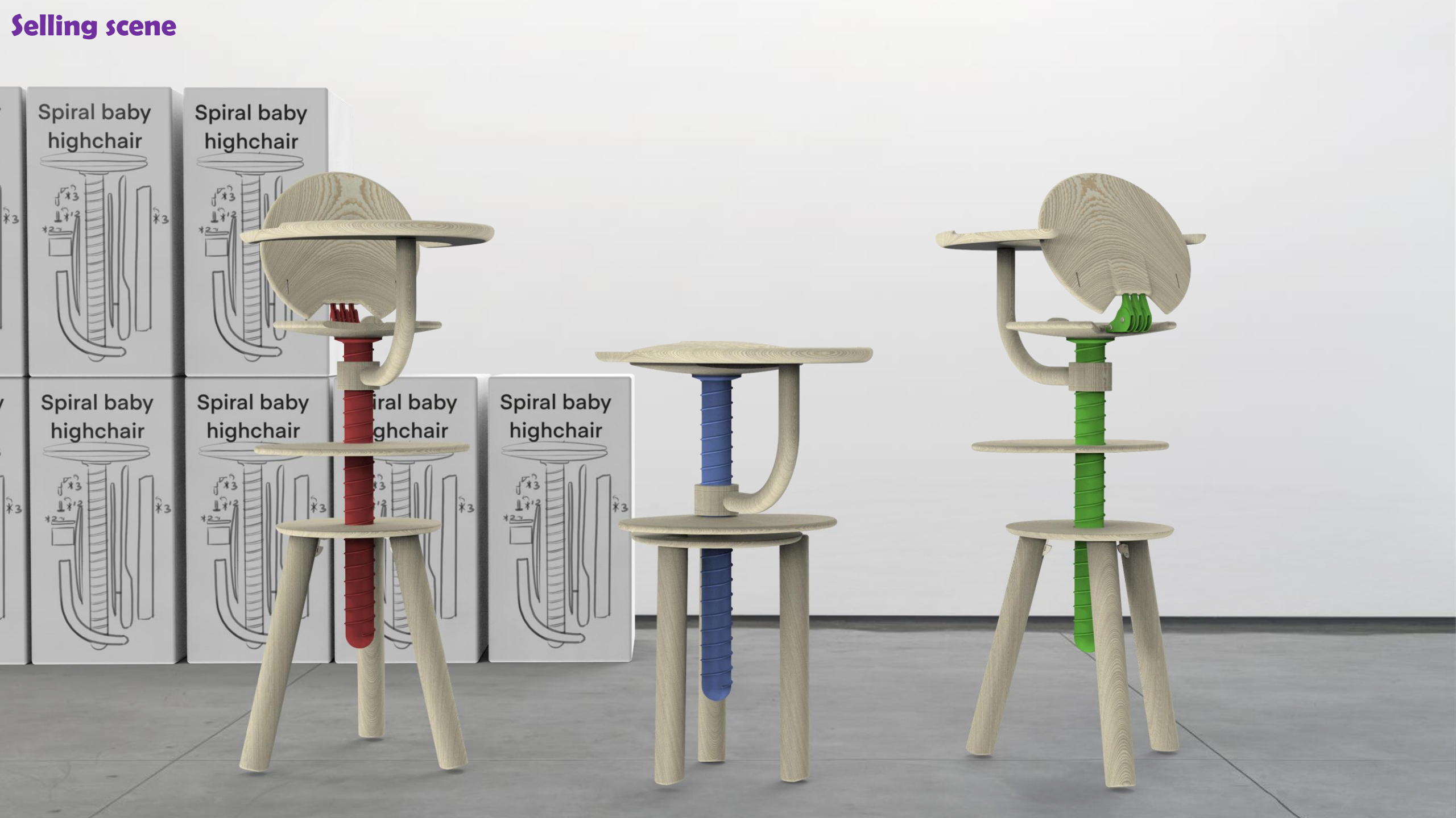 Being extracted from the initial research as pain points, the adjustability of accessories including the whole highchair, the tray and the footrest, and the storage status are two feasible aspects to improve. Inspired by the elements related to the main style of an active and creative home, this product is supported by the main screw, which connects all the accessories by the dynamics of rotating. Additionally, when all the parts are adjusted to their lowest, the spiral baby highchair can be transformed into a decorative table that can add vibrancy to the customer’s home.