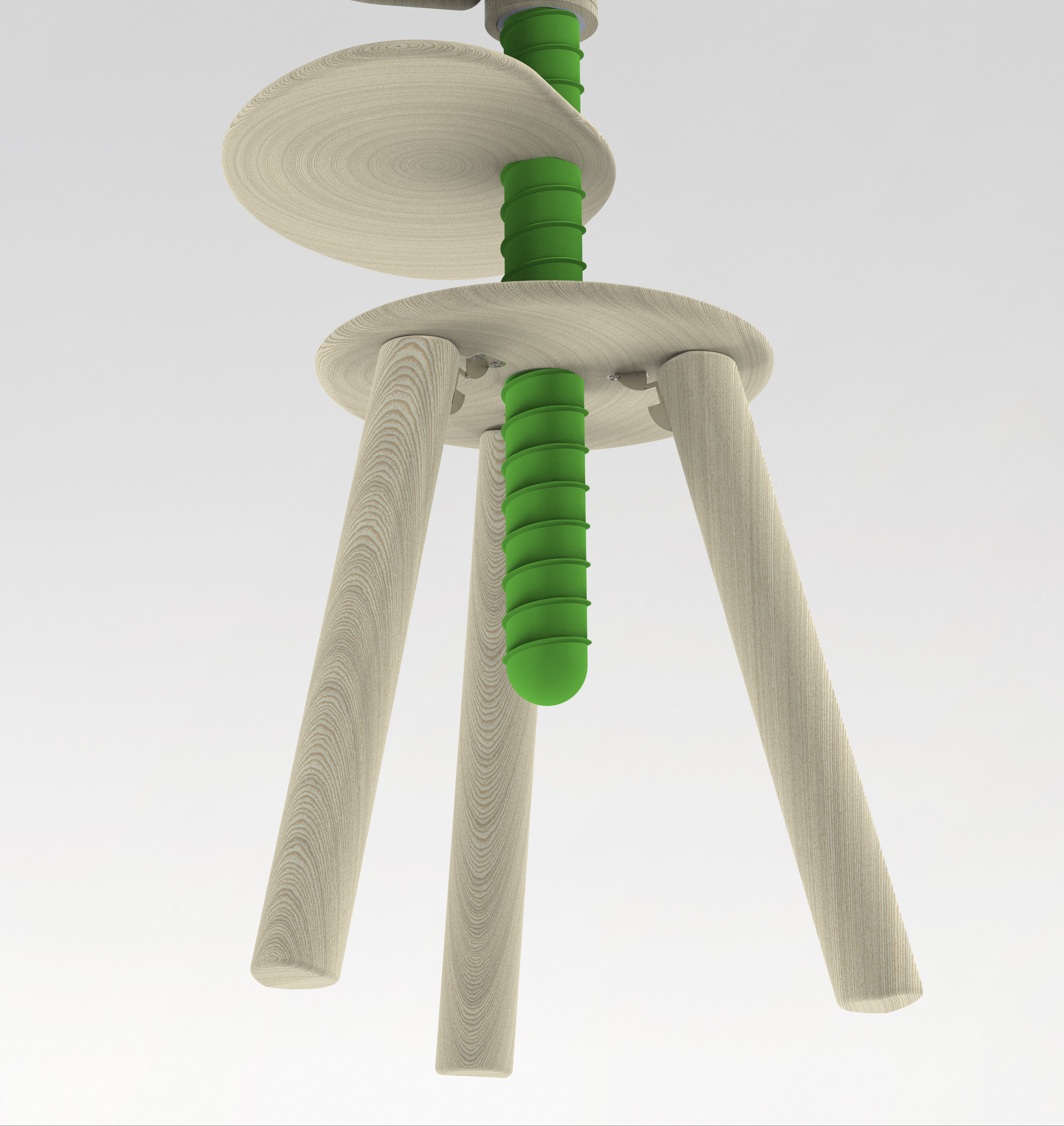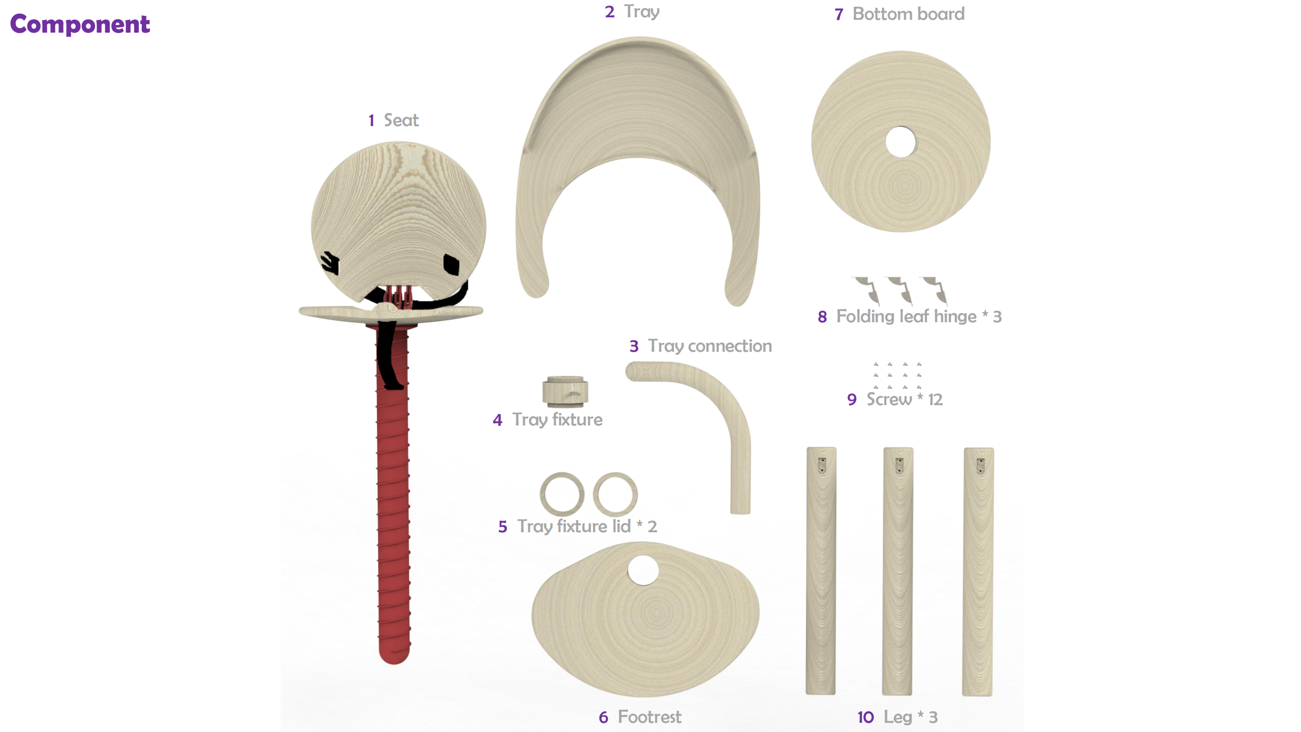 This design contains 10 types of components that are simple enough for the buyers to assemble themselves. The main screw and the seat board are welded together. The seat backrest is connected with the seat board by three folding hinges with the maximum angle of opening to be 135 degrees to fit the ergonomics of the child sitting position during eating. For the legs, there are partial sloping surfaces on both ends, which allows them to splay at 14 degrees, calculated to best support the highchair. As for the tray, there are extensions on both sides, which are just right for children to put their arms on. Besides, the partly raised edge made by a sander is to protect the dishes from falling. When assembling it, the tray fixture, contains two ball bearings at both ends, allowing the tray to move on the same level for the convenience of parents feeding their children. To adjust the height, hold and rotate the fixture lids to make the tray move along with the red screw. When in use, parents can adjust the position of different accessories or even remove them as they like. Since the target market is toddlers aged from 1 to 3 years old, the seat height of this product ranges from 75 cm to 1 m.