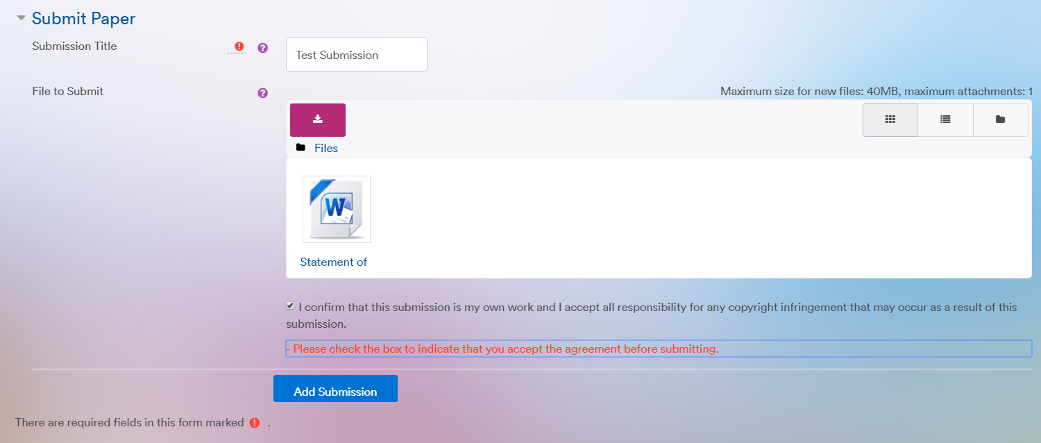 TurnItIn also requires you to title your work as well as agreeing to their terms and conditions. Ensure that the checkbox is ticked and that a title is given before proceeding, your submission title must contain your Student ID, module code and then your title. Click 'Add Submission'.