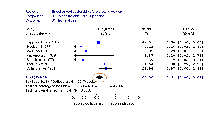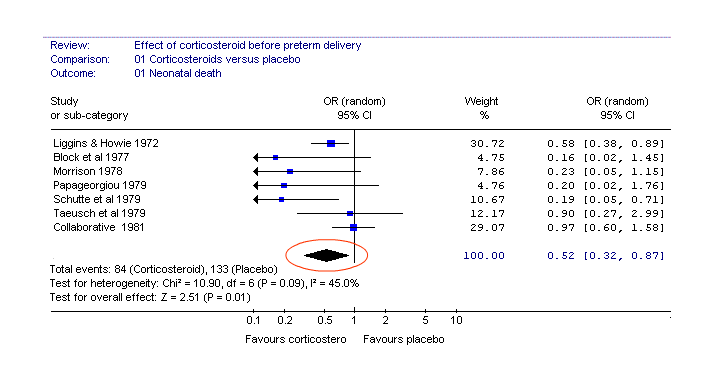 There are two main types of methods that can be used when performing a meta-analysis. These are called the ‘fixed effect method’ and the ‘random effect method’. The choice over which method is more appropriate depends primarily on the level of heterogeneity between the individual studies. If low levels of heterogeneity are detected, indicated by an I2 value less than 40%, then it is appropriate to use a fixed effect method to pool the data. If there are moderate levels of heterogeneity between the study results, indicated by an I2 value between 40% and 84%, then it would be more appropriate to use a random effect method. A random effect method has the advantage that it allows for the heterogeneity between the studies to be taken into account. This is shown by the width of the confidence intervals for the pooled result getting wider than would be seen if a fixed effect method was considered. However, if an I2 value of 85% or more is seen in a meta-analysis, this would indicate that high levels of heterogeneity are present in the meta-analysis. In this situation even the random effect method can not account for the heterogeneity and so the meta-analysis should be abandoned since the individual results are too different to combine together. In our example, the I2 value was 45%. Therefore it would be more appropriate to use a random effect method. If we change our method from a fixed effect to a random effect we can see that 95% confidence intervals have got slightly wider.