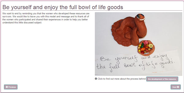 A moving resource telling stories from women survivors of domestic violence. This resource was developed with Nottinghamshire Healthcare and Julie McGarry’s team at The University of Nottingham and was created through workshops with survivors who created artefacts and related their stories.