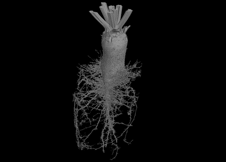 The X-ray CT scan clearly shows the thick tap root of the beet plant where the sugar is stored in the tissues. This variety of beet plant has been selectively bred to grow a large high sugar content tap root.