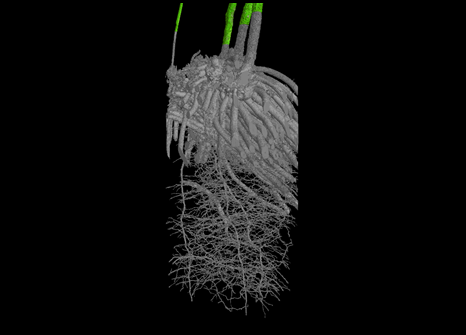 This X-ray CT scan is of a soil core taken from a larger pot and hence why the roots appear cut in a cylindrical shape. Interestingly, there are very thick roots which grow from a mass of tissue just below the soil. Beneath these very thick roots are much thinner ones that are able to grow further into the soil.