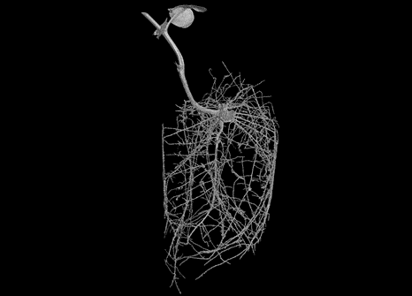 This video shows the developing root system of a 14 day old pea plant. The shoot and root having developed from inside the pea. The root architecture developing from one primary root which grows downwards more or less straight. From this primary root a large number of secondary (or lateral) roots have branched to fill the pot as it has grown.