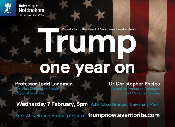 This lecture sees debate and exchange of ideas on the first year of Donald Trump's administration, with Professor Todd Landman (PVC, Social Sciences), Dr Christopher Phelps (associate professor, American and Canadian Studies), and audience participation and dialogue.