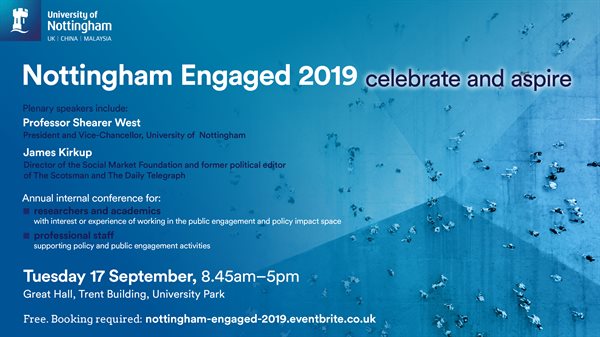 Brought to you by the University of Nottingham Institute for Policy and Engagement, the third annual internal conference on policy and engagement is aimed at researchers, academics and professional staff across all disciplines working in or supporting policy impact and public engagement.