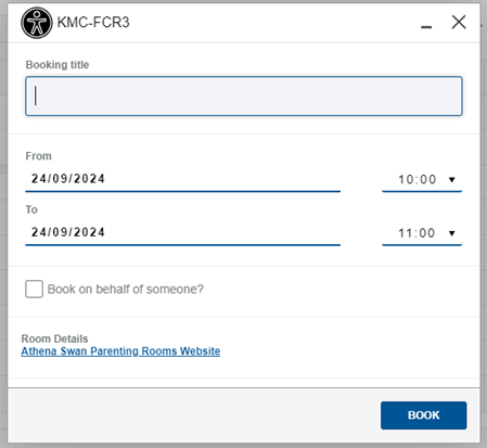 3. Click on the room you would like to book and click on your preferred date/time in the calendar. Complete the details in the pop-up box (minimum booking time15 minutes).