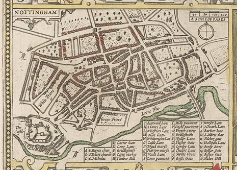 John Speed’s plan of the city of Nottingham, 1610, courtesy of Manuscripts and Special Collections, University of Nottingham