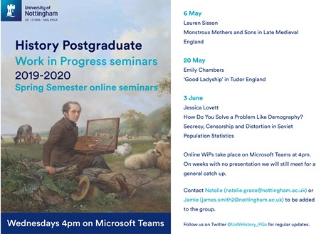 History Postgraduate Work in Progress seminars are organised by History postgraduates (both taught and research) for History postgraduates. They offer the chance to develop presentation and research skills, to share your experience, to seek help and advice, and to get to know your fellow postgraduates and their research.
