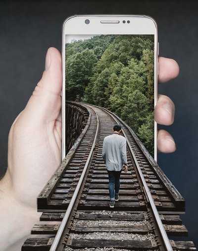 A hand holds a phone, where an image of a man walking along a railway track extends out of the phone into the foreground.