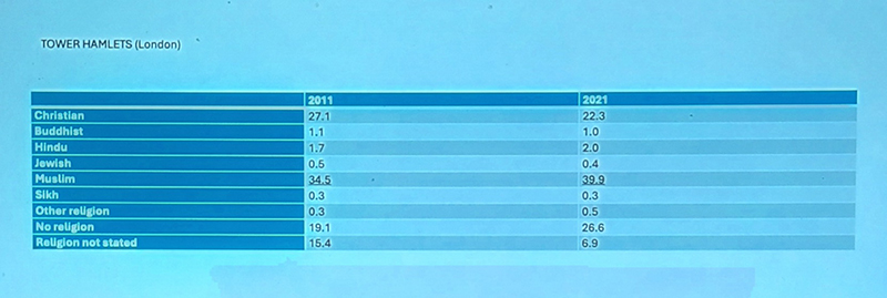 However, the stability of religious adherence in Tower Hamlets with its large number of Muslims appears to question the secularization thesis. This could be due to religion functioning more communally for Muslims than it does for Christians.