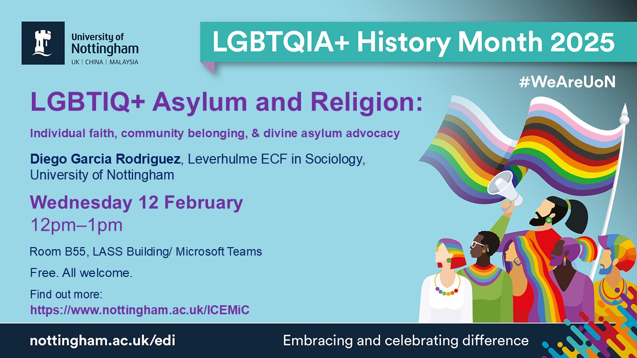 Please hold this space in your diaries if available to attend this school research seminar for LGBTQIA+ History Month, arranged by ICEMiC. In this talk, Dr Diego García Rodríguez will speak on the topic "LGBTIQ+ Asylum and Religion: Individual Faith, Community Belonging, and Divine Asylum Advocacy".