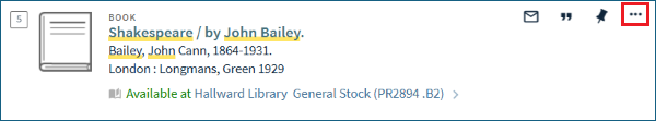 For multiple resources, select the records to be exported using the tick boxes to the left of the titles. Click the three dots icon (Show export options) above your results or saved records list.