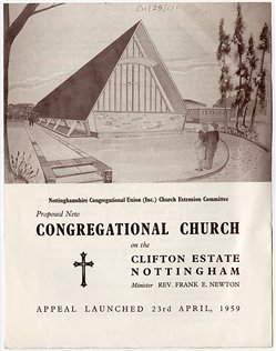 Clifton was the last new church to be promoted by the Nottinghamshire Congregational Union. It began with a Sunday School established in 1955. Services began on 3 June 1956. In 1957 Stanley Whiffen was appointed as a student pastor. The following year Rev. Frank Newton was ordained as the church’s first minister. The church hall was opened on 21 January 1961, on the corner of Green Lane and Southchurch Drive in the new Clifton estate. It was intended as the first in a complex of buildings, including a new church in a striking modern design (see the appeal brochure on the right), but the church was never built and the church hall continued to be used for services. The congregation joined the United Reformed Church in 1972.