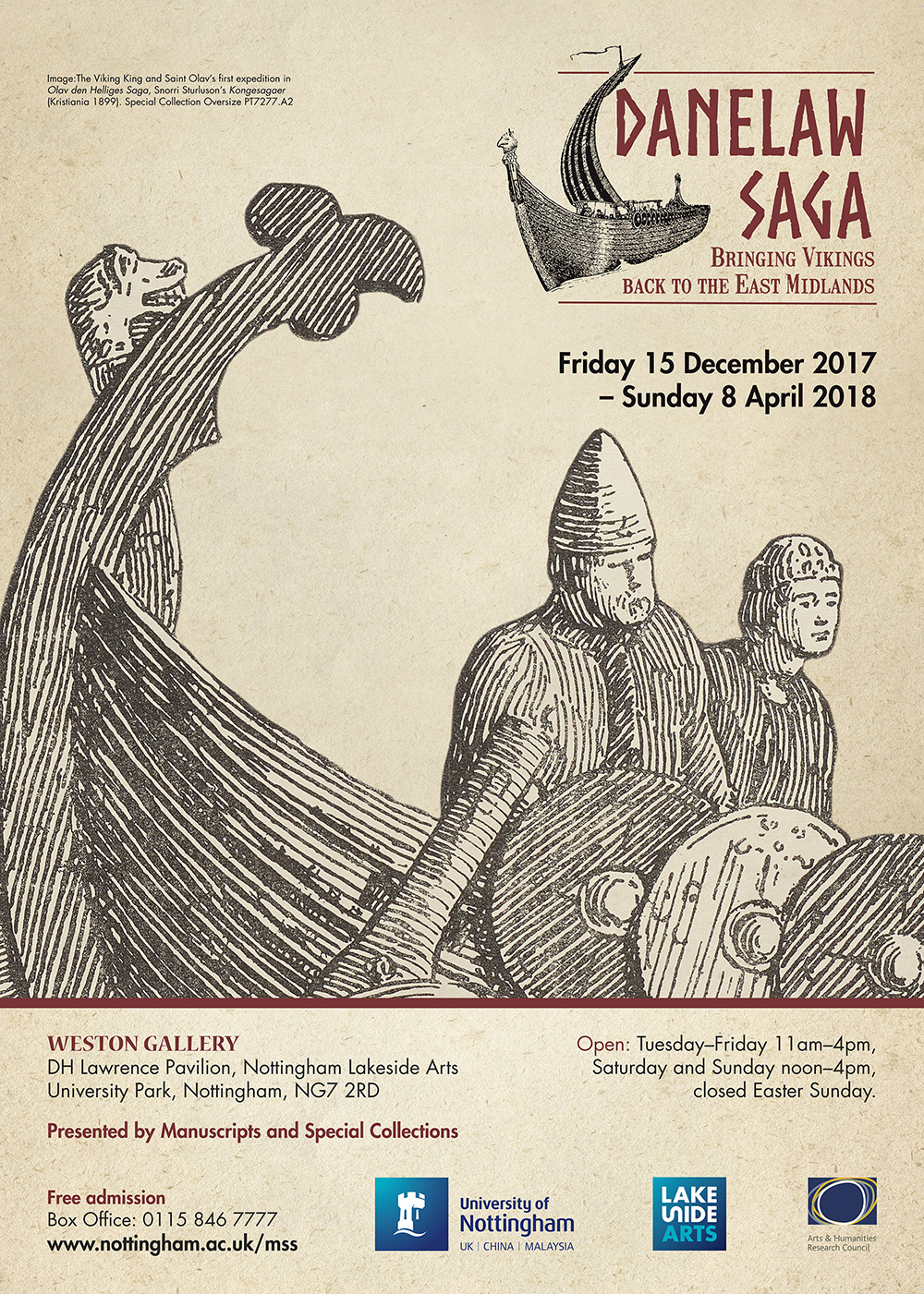 ‘Danelaw Saga’ was jointly curated by Professor Judith Jesch and Dr Roderick Dale of the Centre for Study of the Viking Age, and by Manuscripts and Special Collections at the University of Nottingham. The Bringing Vikings back to the East Midlands project was funded by the Arts and Humanities Research Council.