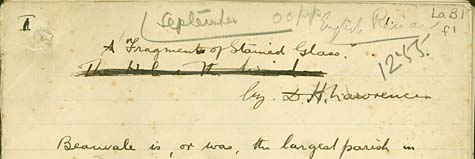 The manuscript of the third story Lawrence wrote for the competition survives among the papers of Louie Burrows, copied in her hand. Entitled 'Ruby Glass', and entered under the pseudonym Herbert Richards, it was subsequently revised and published by Lawrence as 'Fragment of Stained Glass' in The English Review, 1911.