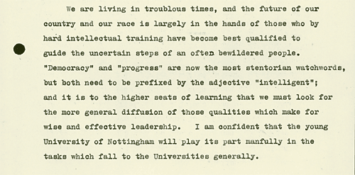 In his letter of acceptance he reflects on the importance of higher education and his pride in The University of Nottingham's development (UR 450).