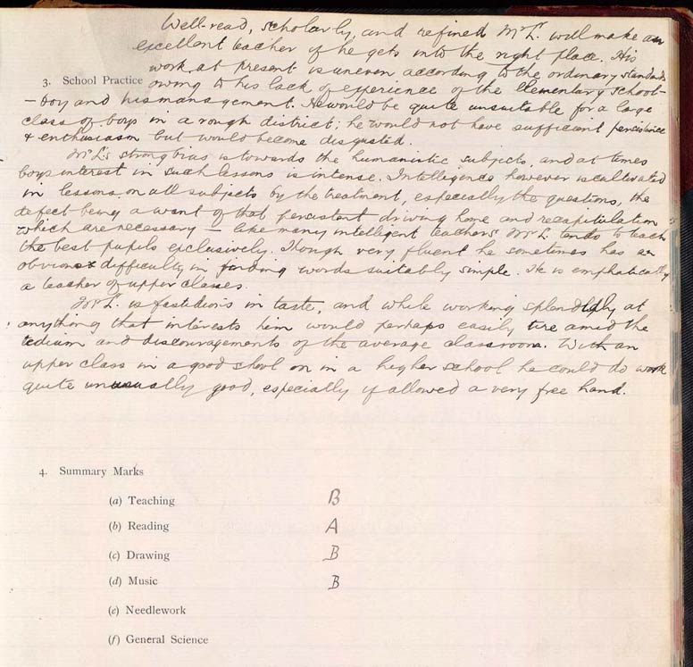 A fascinating record survives in the official assessment of Lawrence as a potential school teacher in the University of Nottingham Day Training College student register for 1906-1908. His intellectual gifts were clearly appreciated, but there was anxiety too that his personality might not suit all classrooms.